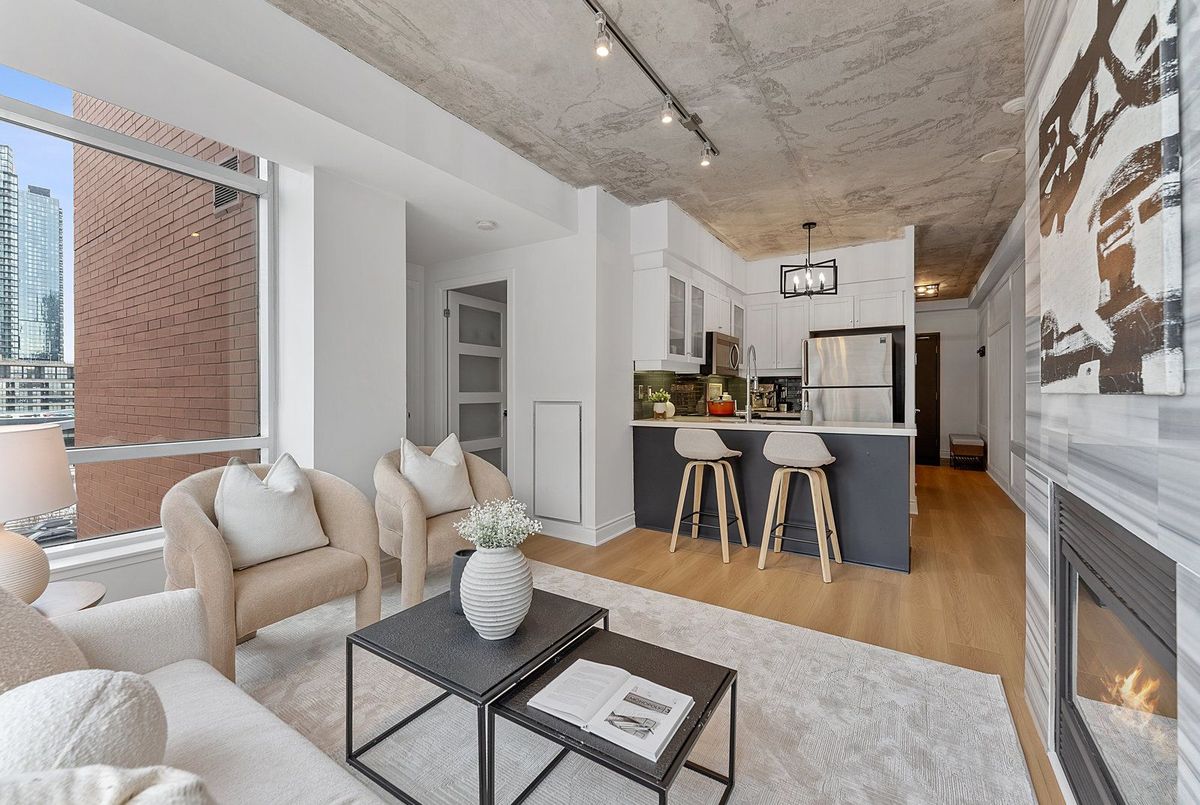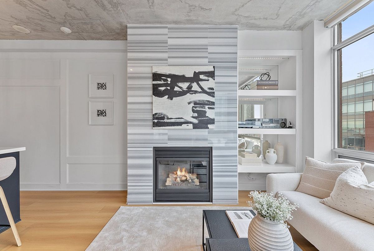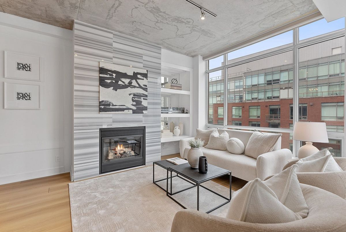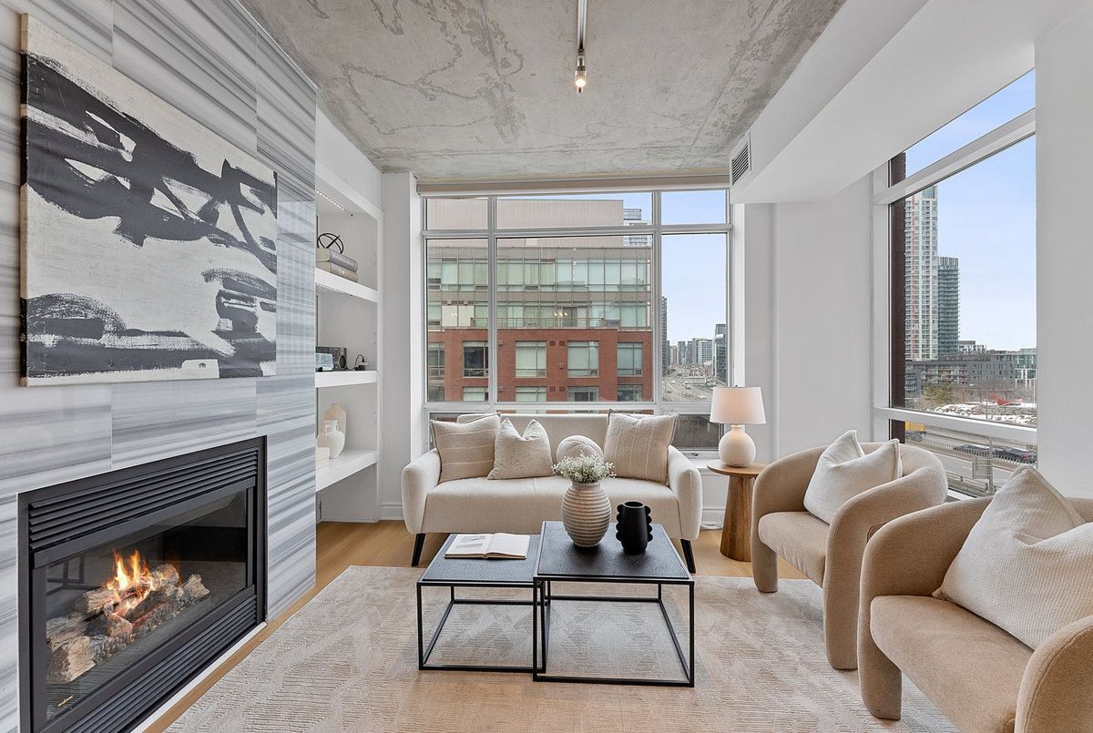 It's the best of all high-end urban lifestyles, with this stylish 1+1 corner suite at the shore of Lake Ontario, yet still in the heart of the thriving city. Enjoy the dazzling vibrancy of Toronto's skyline to the north, the twinkling and constant river-like flow of the Gardiner to the west, and the pull of the sparkling lake to the south. Just imagine the sunsets. This 745 sq ft suite combines modern loft-like glam with exposed concrete ceilings, while surrounding you with custom wall treatments and an exquisite floor-to-ceiling gas fireplace that's wrapped in elegant, polished stone, and boasts a built-in bookcase and rough-in for mounted TV. A large separate den gives you many options: from a home office to a formal dining room, or maybe your ideal TV room, or perhaps even an easy-to-create 2nd bedroom. This special home comes with a storage locker and a preferred parking spot with sought-after buffer zone on one side. Your own EV Charger is also fully hooked-up and ready-to-go for the next owner. 500 Queens Quay West is an exclusive and secure luxury boutique building, in a prime Harbourfront spot, mere moments away from the busy and bustling downtown core. Residents of this mostly owner-occupied building enjoy a wonderful outdoor BBQ and dining area, gym, party room, meeting room, sauna, and top-of-the-line management and concierge staff. Plus there's underground visitor parking for your guests. Endless options for entertainment, dining and nightlife await. Health and nature lovers will love the Martin Goodman Trail, Toronto Music Garden and water taxis right outside the front doors. Multiple dog parks are just a short stroll away. Super convenient access to the expressway, Toronto Islands, Island Airport, TTC and exciting spots like Rogers Centre, Scotiabank Arena and the CN Tower.