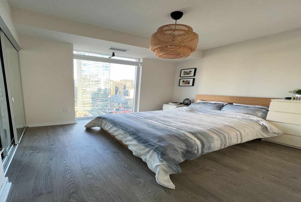 Luxury "The Pj Condo" By Pinnacle, 1 Bed+1 Den corner Unit, Den Used As Study Or Could Fit 2nd Bed, Bright and open Living/Dinning, Modern Kithch with S/S Appliances, Granite Countertop, Floor to Ceiling Windows. Heart Of The Most Prestigious Entertainment District Of Toronto For The Fans Of Maple Leaf/Blue Jays/Raptors And Tiff. Steps To Street Car And Within Walking Distance To Queen West, Financial And Entertainment Districts, Restaurants, Bars, CN Tower, Ripley's Aquarium, Toronto's Lakeshore And Much. Two Subway Stations: St.Andrew And Osgoode Stations, Roger's Centre Etc. A+ Amenities: 24 Hour Security Concierge, BBQ, Business Center, Outdoor Pool, Private Party and Dining Room, Fitness Room. **EXTRAS** Den has floor ceiling window with beautiful clear east view of the Financial District! Full size stacked washer and dryer, microwave, floor To ceiling windows, oversized open balcony, 9 Ft ceiling, can be Furnished.