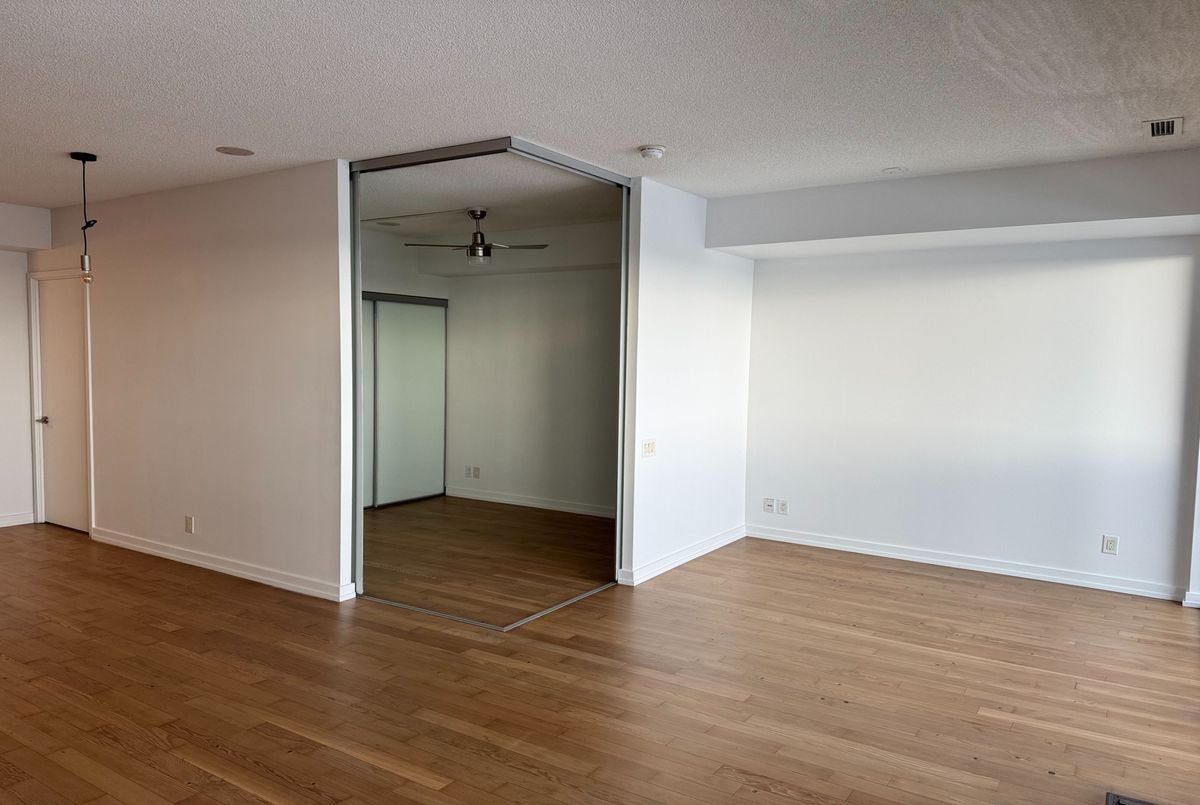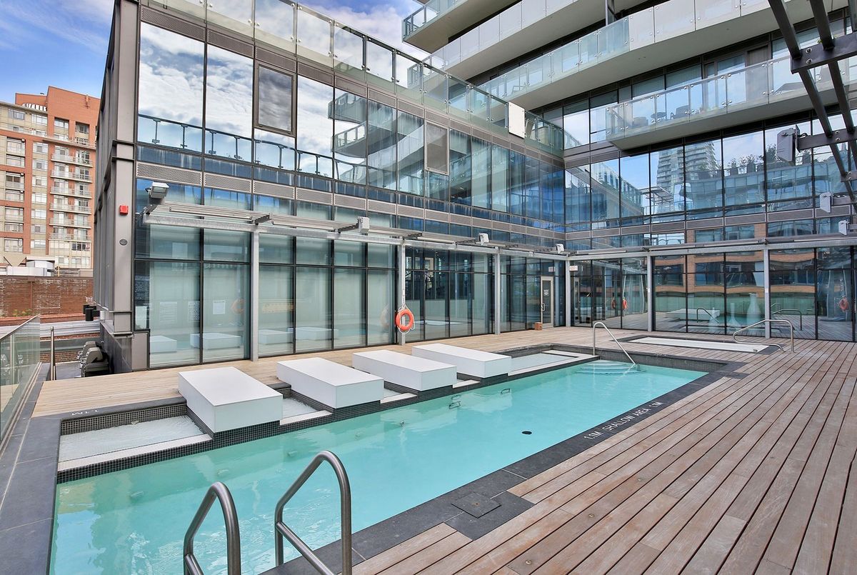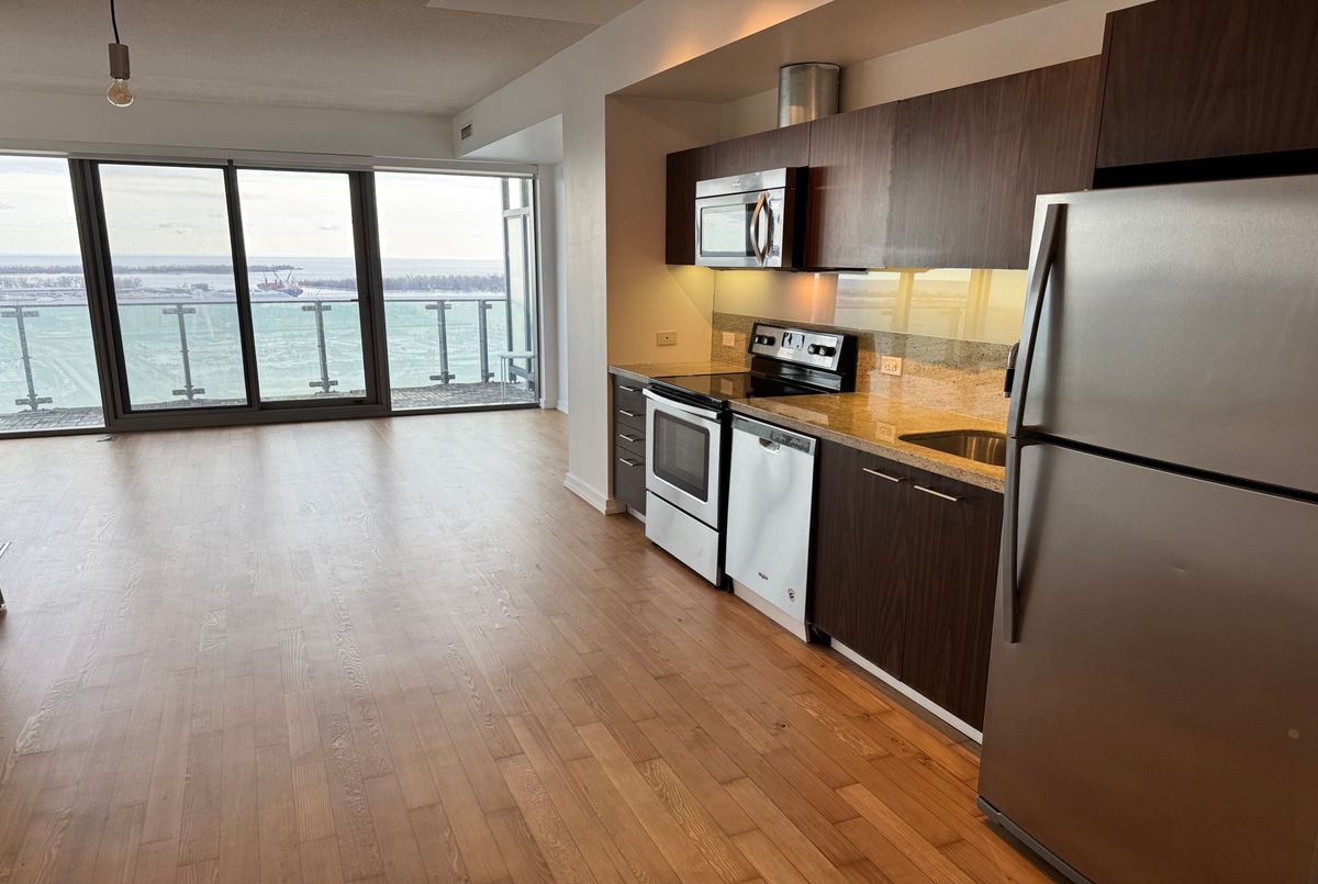 Distillery District living at it's best in The Gooderham! This bright and spacious 1 bedroom + den features 9' ceilings, floor-to-ceiling windows, hardwood flooring and stunning unobstructed views of the lake and Toronto Island. The large eat-in kitchen is equipped with stainless steel appliances, granite countertops and plenty of prep space. The bedroom includes a full-size double closet and direct access to the 4-piece semi-ensuite bathroom with rain shower head. This floor plan offers a multitude of options with respect to furniture placement, provisions for a home office and even space for a roommate. There is also a full-width 150 SF balcony that is wide enough for table and chairs or loungers. Extensive amenities include a gym, yoga studio, outdoor pool, BBQ area, guest suites and 24-hr concierge. Easy access to the TTC with the King streetcar loop at your doorstep. And don't forget the fabulous shops, bars and restaurants of The Distillery. Floor plan is attached.