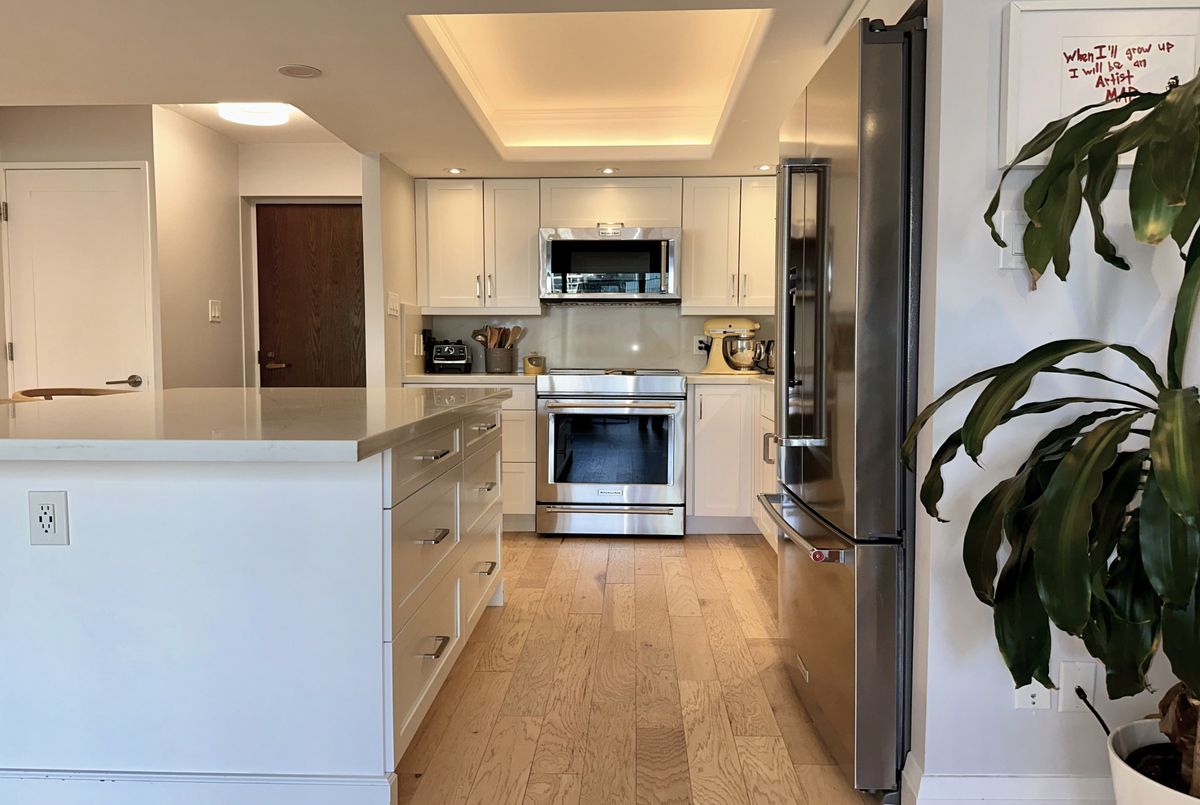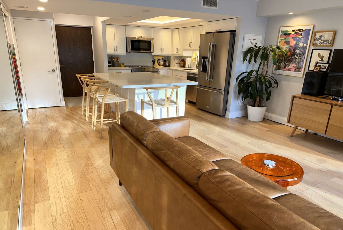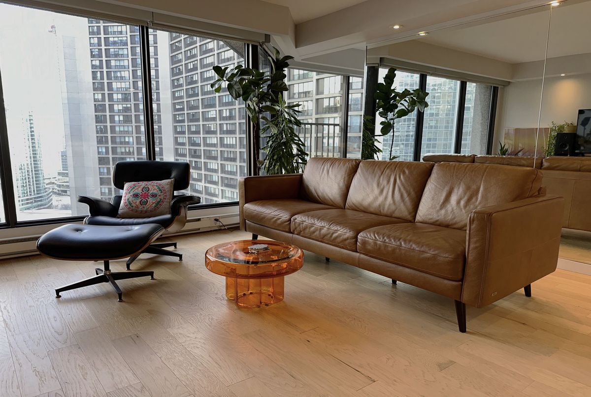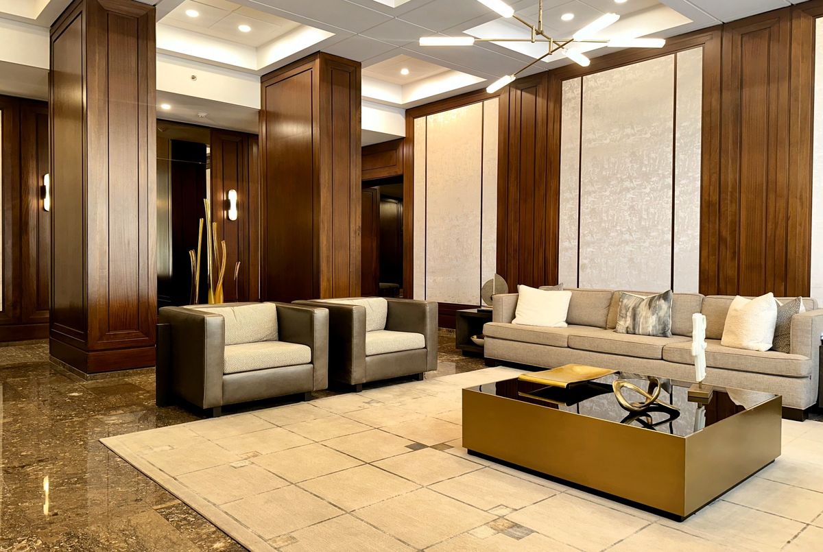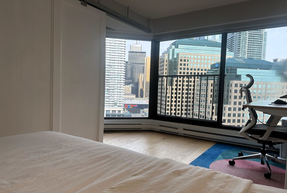 Stunning Modern Condo with Luxury Finishes and City Views. Hydro, Water, Cable, Hi-Speed Internet, Heat, Cooling, Parking are included in rent. Welcome to this exceptional, renovated 1-bedroom, 1-bathroom condo. Featuring hickory hardwood floors throughout, this home offers an open-concept living space bathed in natural light from floor-to-ceiling windows. The living room boasts floor-to-ceiling mirrors, adding an extra touch of sophistication and enhancing the spacious feel. Modern kitchen is a chef's dream, showcasing white quartz countertops, top of the line, stainless steel, KitchenAid appliances (including an induction stove, dishwasher, convection microwave, and XL French door fridge with water filtration), plus a large kitchen island with seating for up to 6. Perfect for entertaining, this kitchen offers ample storage and prep space. Relax in the oversized bedroom, complete with a generous walk-in closet for all your storage needs. The bathroom is a luxurious retreat with marble floors, walls, and countertops, featuring a step-up deep soaker tub for the ultimate in relaxation. Enjoy the added bonus of a dedicated office space with sweeping city views, ideal for working from home. Step out onto the floor-to-ceiling Juliet balcony for fresh air and scenic surroundings. Additional highlights include a premium Bosch washer and dryer and easy access to vibrant city amenities. Lakefront building offers amazing amenities such are Swimming Pool, Squash court, Gym, Sauna, Billiard room, Library, Bar, Large Roof Top deck with grass part, Shuttle Bus Service, Full time consierge service and security and more...