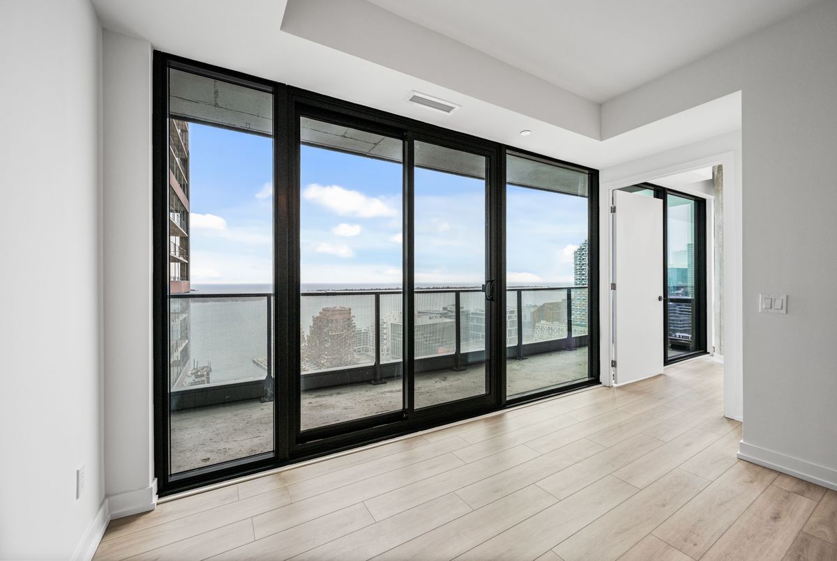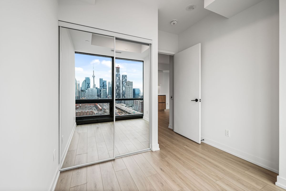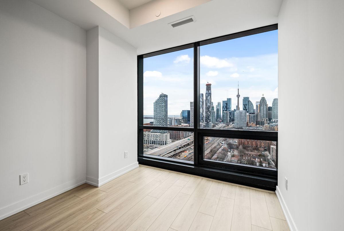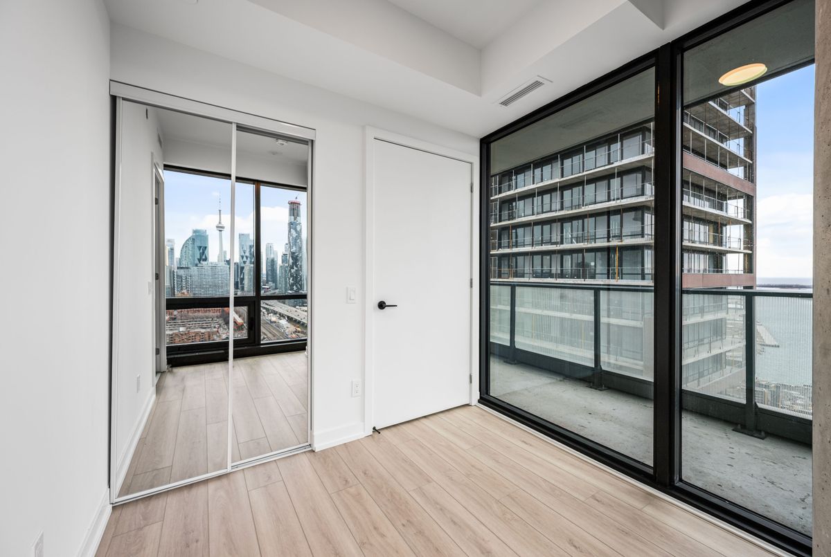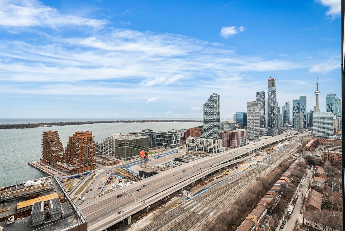 Welcome to Brand New Suite2904 at The Goode Condo. This elegant 3-bedroom, 2-bathroom South-West facing corner suite offers a rare wrap-around balcony with stunning unobstructed city skyline and lake views. Bright and spacious with a functional split-bedroom layout, floor-to-ceiling windows, and a modern open-concept design. Contemporary kitchen with integrated appliances and stone countertops. Primary bedroom features a private ensuite and generous walk-in closet space. Good for families need home office space. Located in the heart of the Distillery District, steps to transit, boutique shops, top restaurants, waterfront trails, and St. Lawrence Market. Premium amenities are open to use: include 24-hour concierge, outdoor pool, fitness centre, yoga studio, co-working lounge, pet wash, and visitor parking.