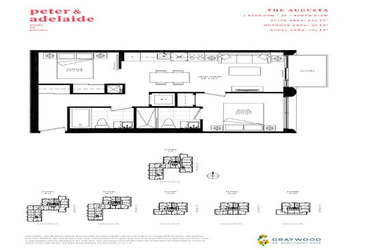 Welcome to Peter & Adelaide, a residence offering modern design and unbeatable downtown convenience! This spacious 2-bedroom, 2-bathroom suite features an open-concept layout, floor-to-ceiling windows, and a private balcony. The sleek kitchen includes built-in stainless steel appliances, ideal for everyday living and entertaining. Located in the heart of downtown, steps to the PATH, Financial & Entertainment Districts, subway, and transit, with top dining and shopping nearby. Enjoy premium amenities including a rooftop pool with BBQs, fitness & yoga studio, co-working space, sauna, party lounge, and more!