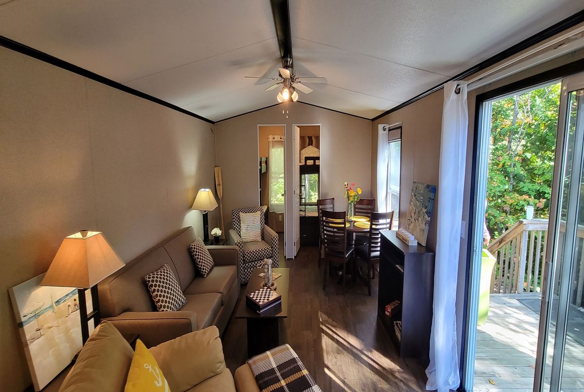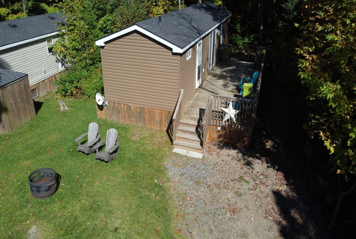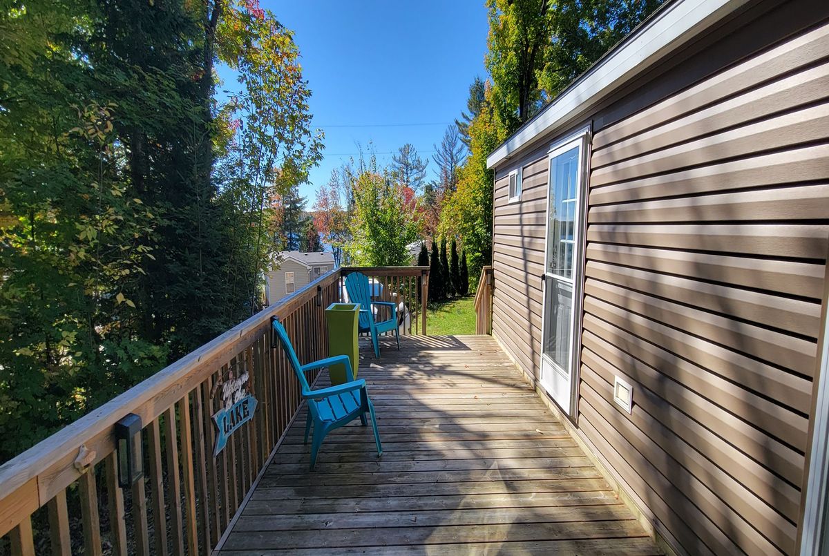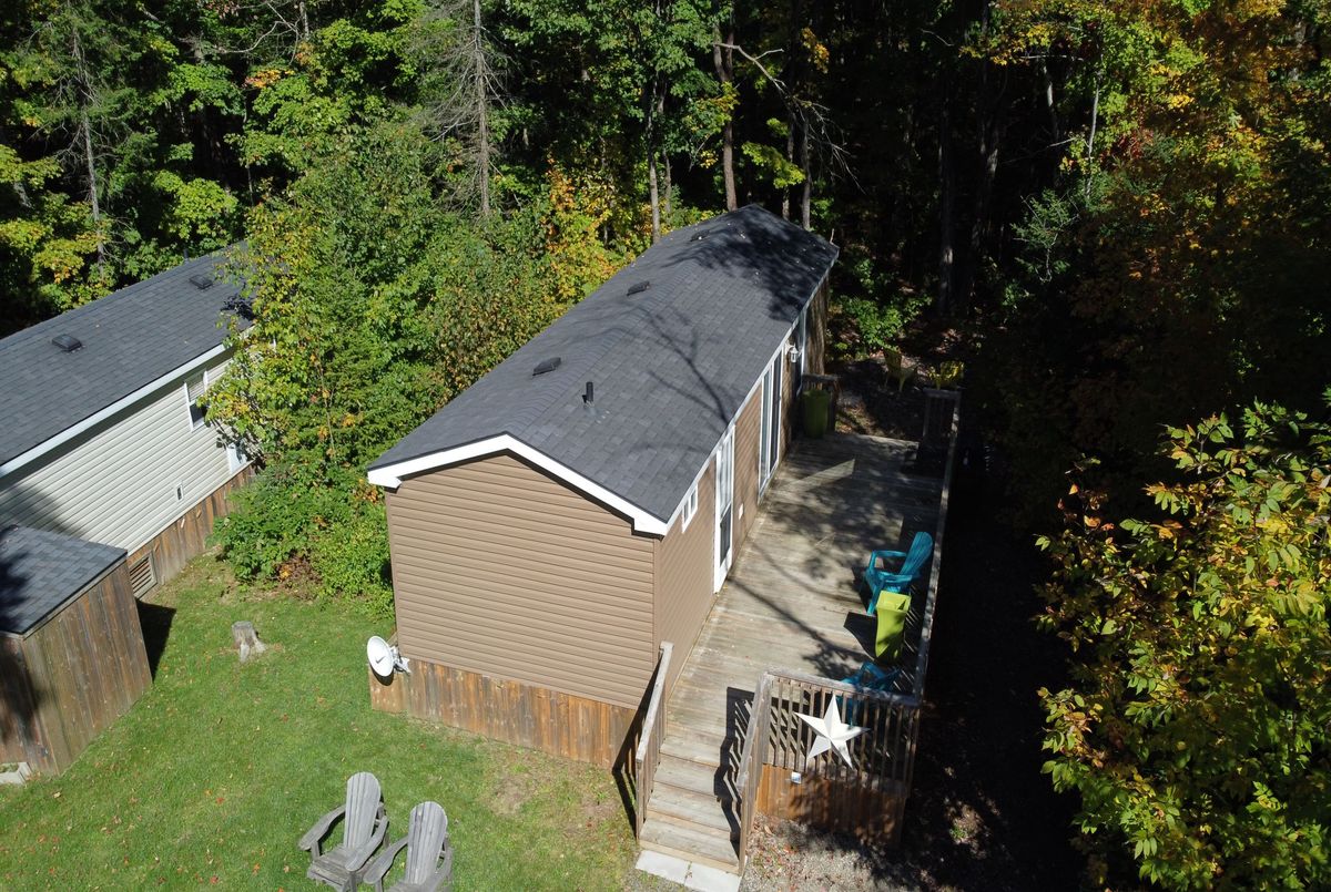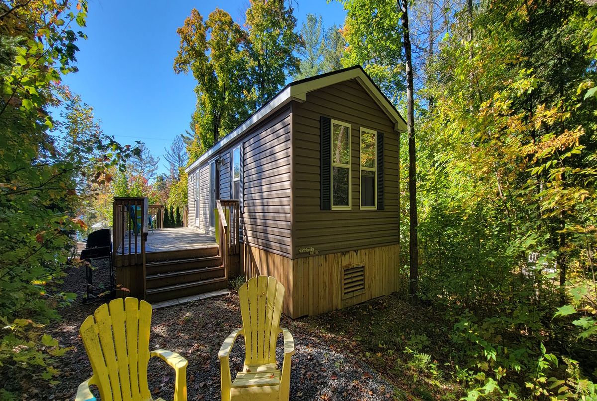 This is an amazing way to have an affordable cottage in Muskoka at a reasonable cost. Great Blue Resort's Bonnie Lake Resort is located on a spring-fed lake which is quiet and motor-free. Canoes and kayaks are available for your use. Also, there are fun family activities or send the kids out to have their own fun! Trails, sand beach with southern exposure, jumping pillow, small general store, and more are all available. This is a seasonal resort, open May 1 to October 31. Everything is taken care of: lawns, snow removal, water, septic emptying. Literally nothing for you to do but arrive and start relaxing. Do you need propane? Call ahead and it can be ready for your arrival. Strees and worry-free enjoyment for retired couples or families. Great for the snow-birds amongst us: stay here in the summer and fly south for the winter. If there is a time when you will not be usiing it, you can place it on the resort rental program to help offset costs. This is a 2016 Northlander Spruce model in like-new condition with a huge 30 ft x 10 ft deck. The lot is one of the most private and backing onto the Muskoka bush. Sitting areas front and rear with a firepit. Lots of parking for friends and family. The cottage can sleep up to eight people. If you like your alone-time and privacy, this site is ideal. If you like to take part in group activities or mingle with your neighbours (many of whon are long time owners), then you can do that as well. The new resort manager has been very creative in planning events and socials for the owners and guests to take part in. This is definitely worth checking out!