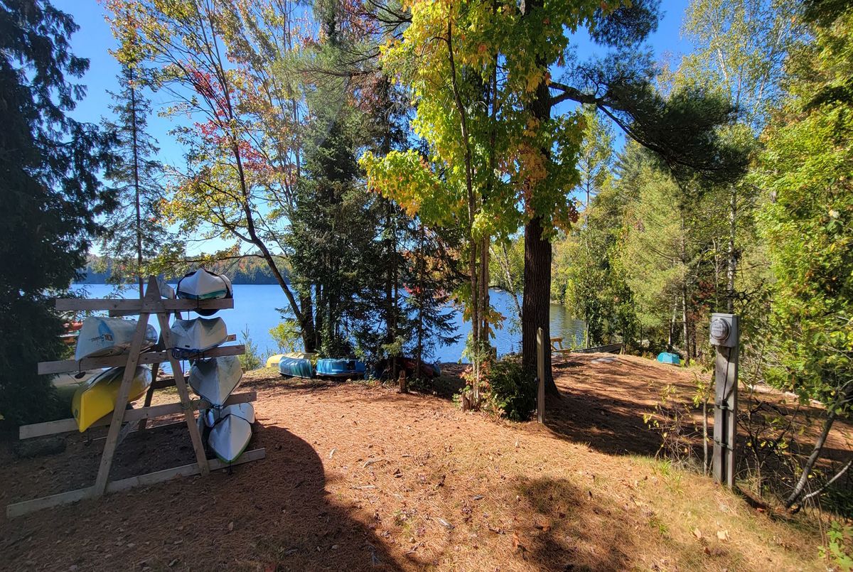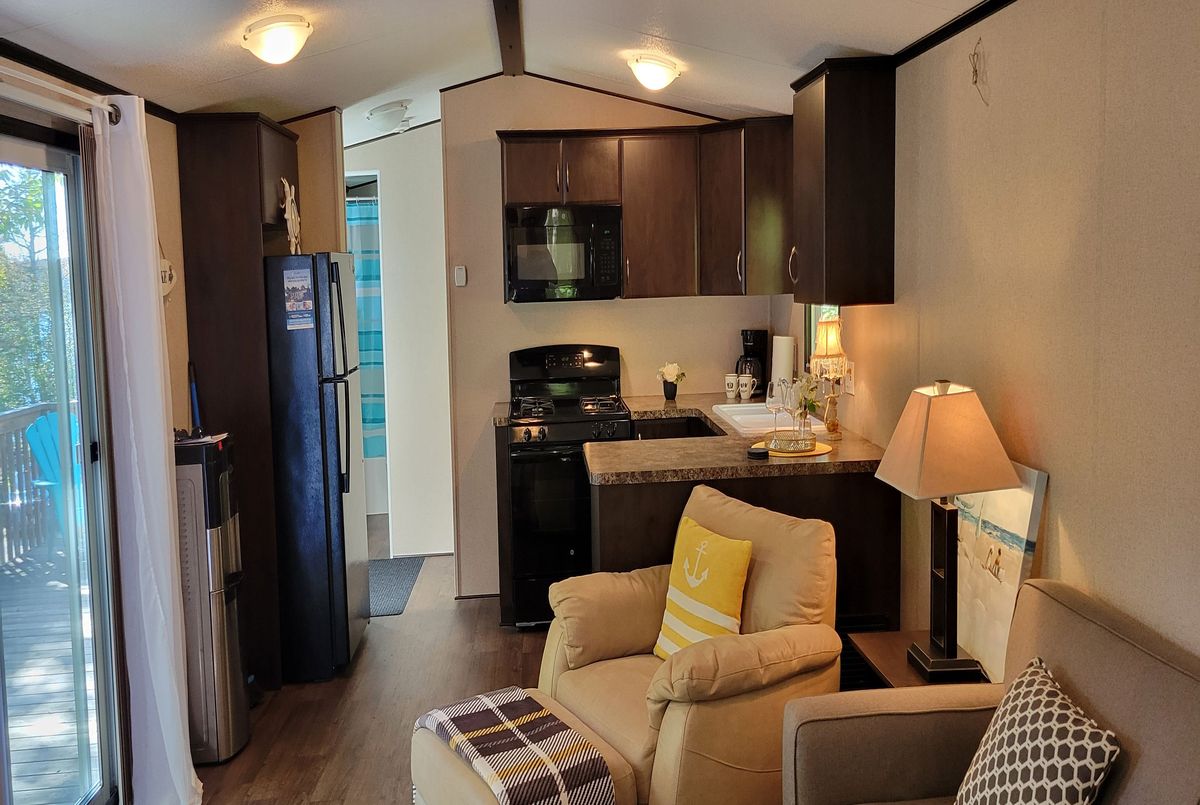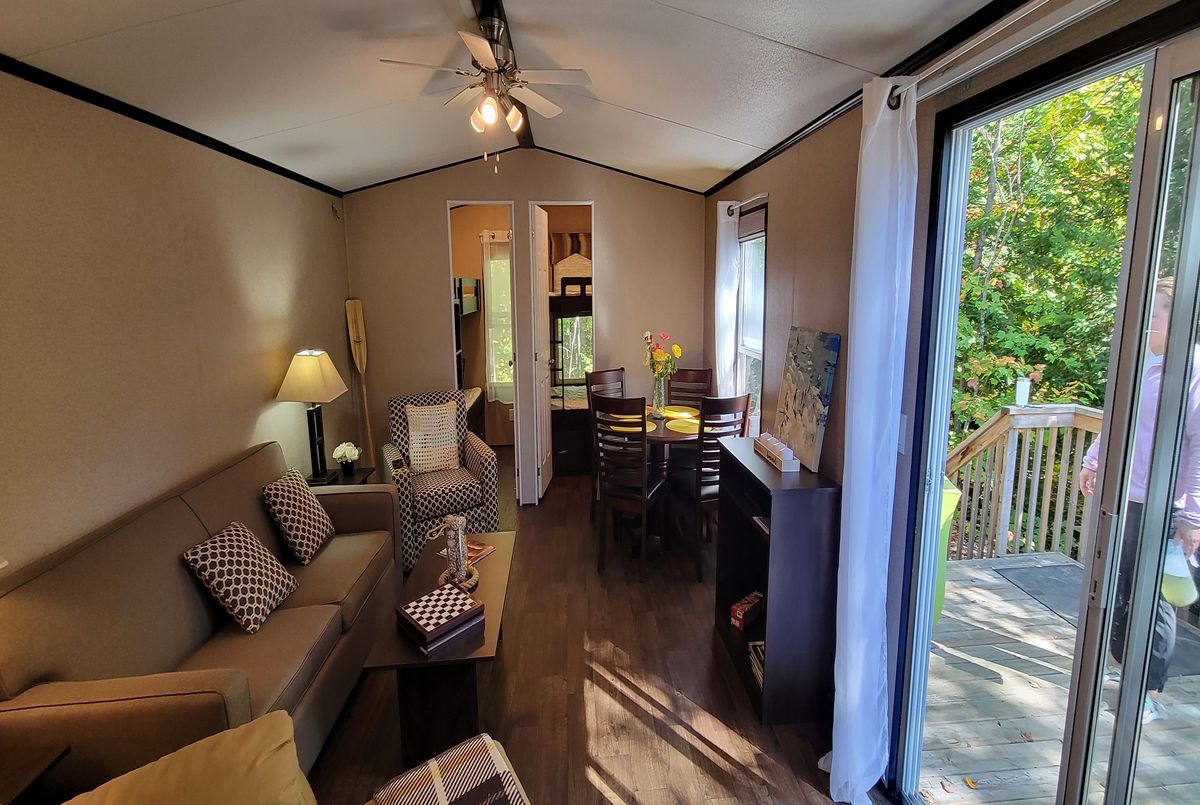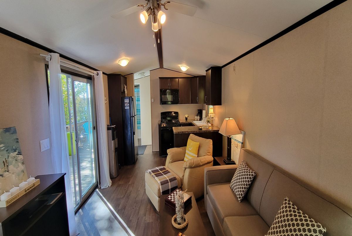 This is an amazing way to have an affordable cottage in Muskoka at a reasonable cost. Great Blue Resort's Bonnie Lake Resort is located on a spring-fed lake which is quiet and motor-free. Canoes and kayaks are available for your use. Also, there are fun family activities or send the kids out to have their own fun! Trails, sand beach with southern exposure, jumping pillow, small general store, and more are all available. This is a seasonal resort, open May 1 to October 31. Everything is taken care of: lawns, snow removal, water, septic emptying. Literally nothing for you to do but arrive and start relaxing. Do you need propane? Call ahead and it can be ready for your arrival. Strees and worry-free enjoyment for retired couples or families. Great for the snow-birds amongst us: stay here in the summer and fly south for the winter. If there is a time when you will not be usiing it, you can place it on the resort rental program to help offset costs. This is a 2016 Northlander Spruce model in like-new condition with a huge 30 ft x 10 ft deck. The lot is one of the most private and backing onto the Muskoka bush. Sitting areas front and rear with a firepit. Lots of parking for friends and family. The cottage can sleep up to eight people. If you like your alone-time and privacy, this site is ideal. If you like to take part in group activities or mingle with your neighbours (many of whon are long time owners), then you can do that as well. The new resort manager has been very creative in planning events and socials for the owners and guests to take part in. This is definitely worth checking out!