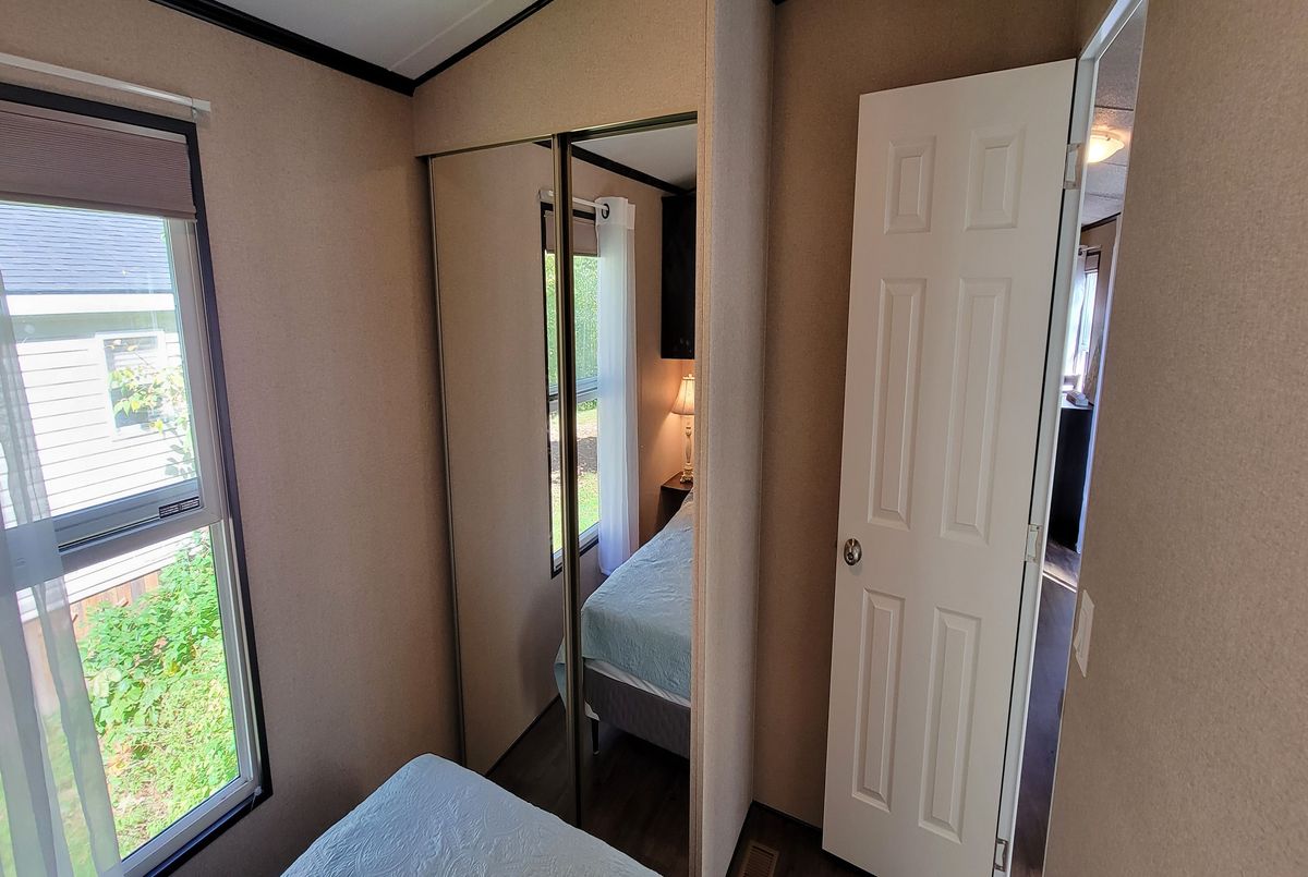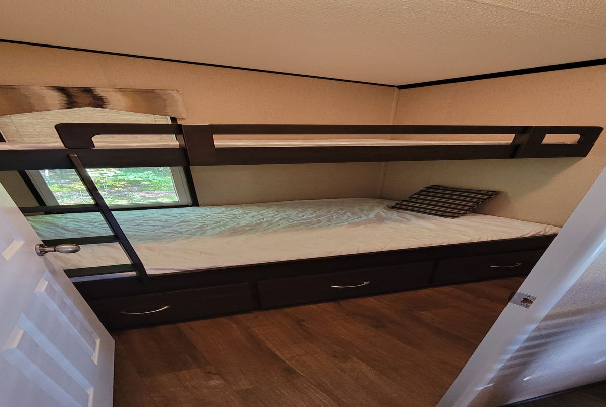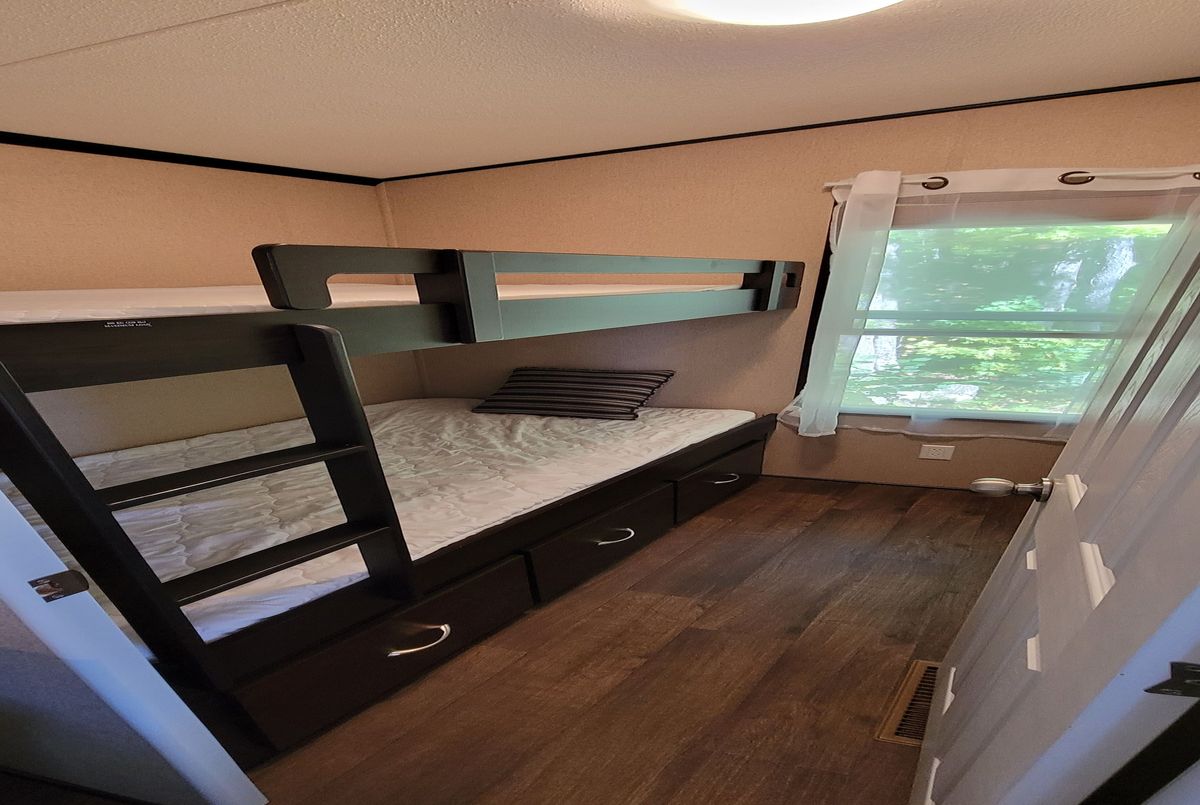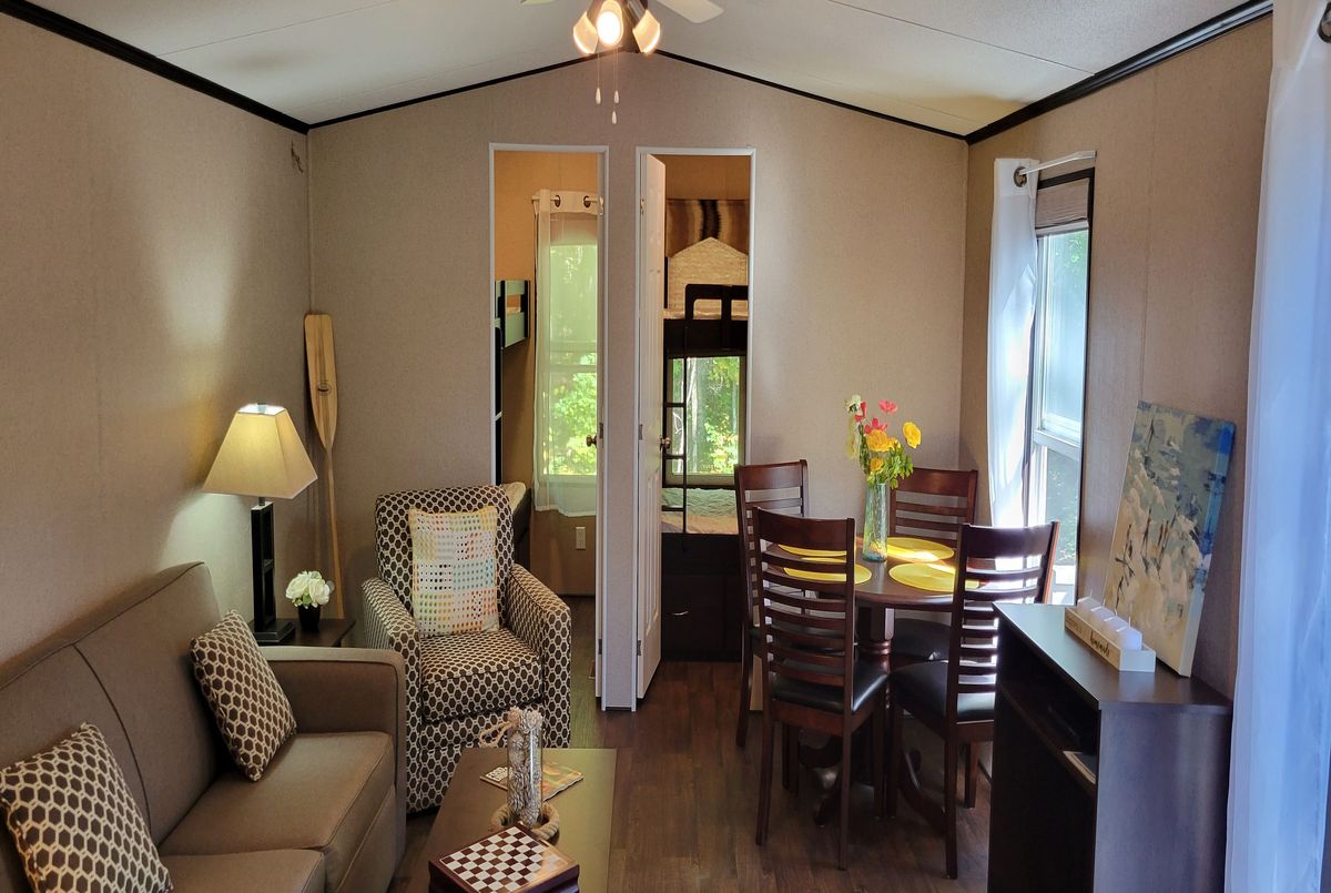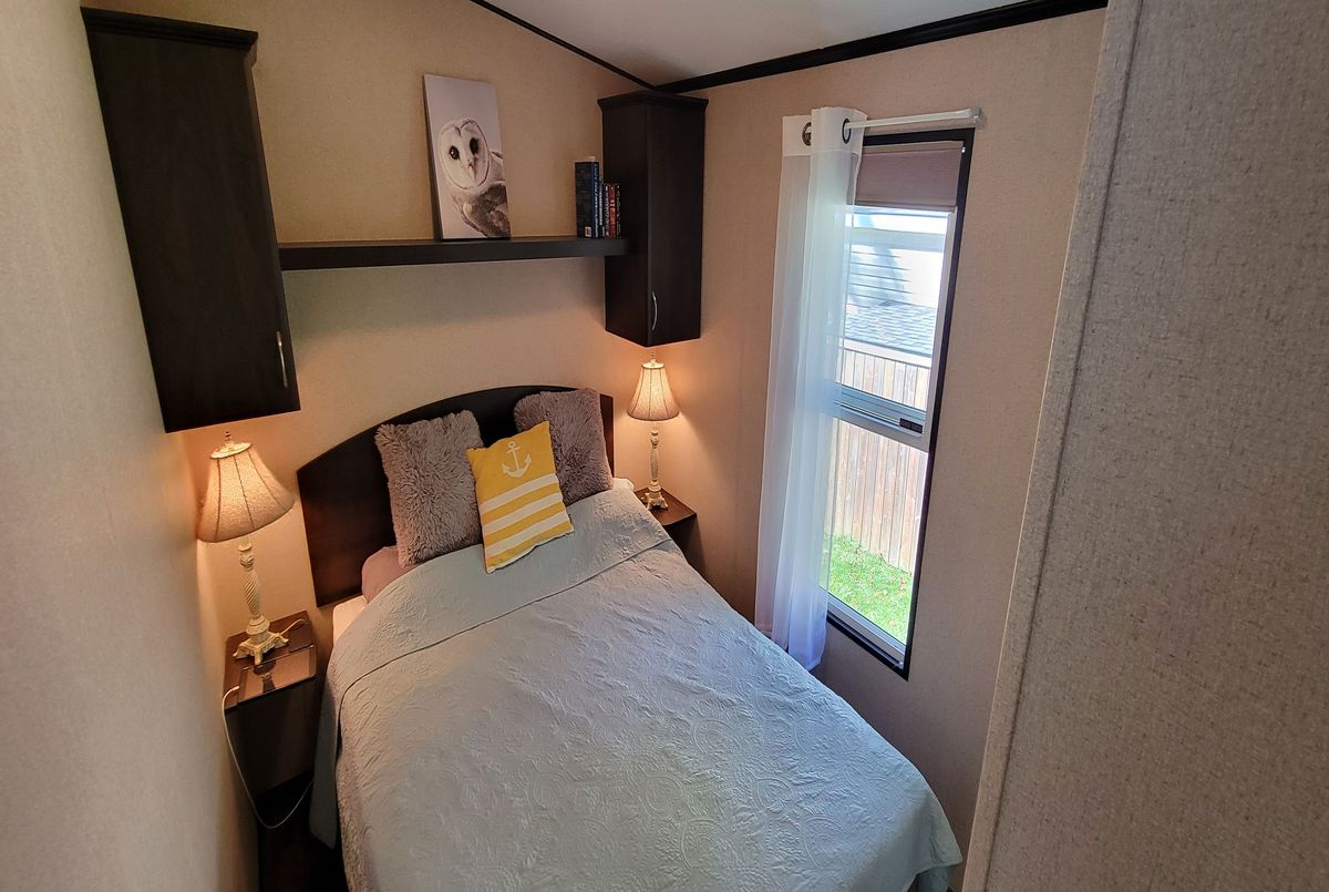 This is an amazing way to have an affordable cottage in Muskoka at a reasonable cost. Great Blue Resort's Bonnie Lake Resort is located on a spring-fed lake which is quiet and motor-free. Canoes and kayaks are available for your use. Also, there are fun family activities or send the kids out to have their own fun! Trails, sand beach with southern exposure, jumping pillow, small general store, and more are all available. This is a seasonal resort, open May 1 to October 31. Everything is taken care of: lawns, snow removal, water, septic emptying. Literally nothing for you to do but arrive and start relaxing. Do you need propane? Call ahead and it can be ready for your arrival. Strees and worry-free enjoyment for retired couples or families. Great for the snow-birds amongst us: stay here in the summer and fly south for the winter. If there is a time when you will not be usiing it, you can place it on the resort rental program to help offset costs. This is a 2016 Northlander Spruce model in like-new condition with a huge 30 ft x 10 ft deck. The lot is one of the most private and backing onto the Muskoka bush. Sitting areas front and rear with a firepit. Lots of parking for friends and family. The cottage can sleep up to eight people. If you like your alone-time and privacy, this site is ideal. If you like to take part in group activities or mingle with your neighbours (many of whon are long time owners), then you can do that as well. The new resort manager has been very creative in planning events and socials for the owners and guests to take part in. This is definitely worth checking out!