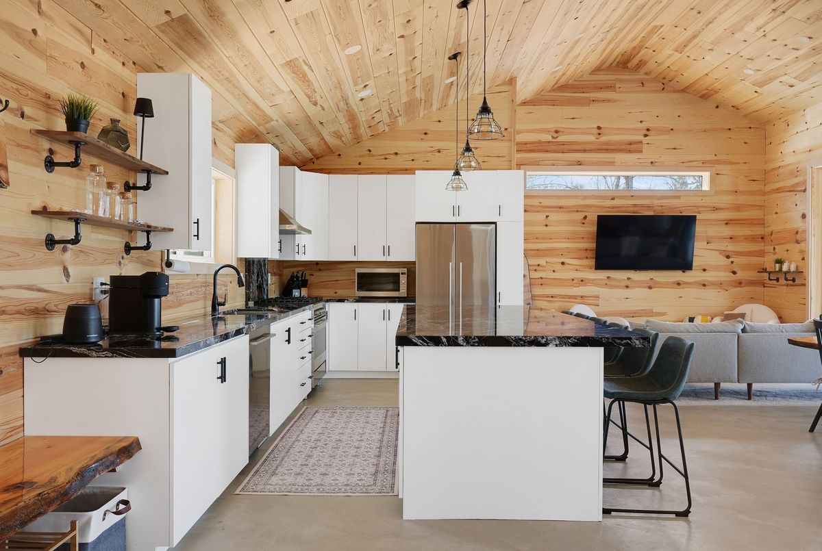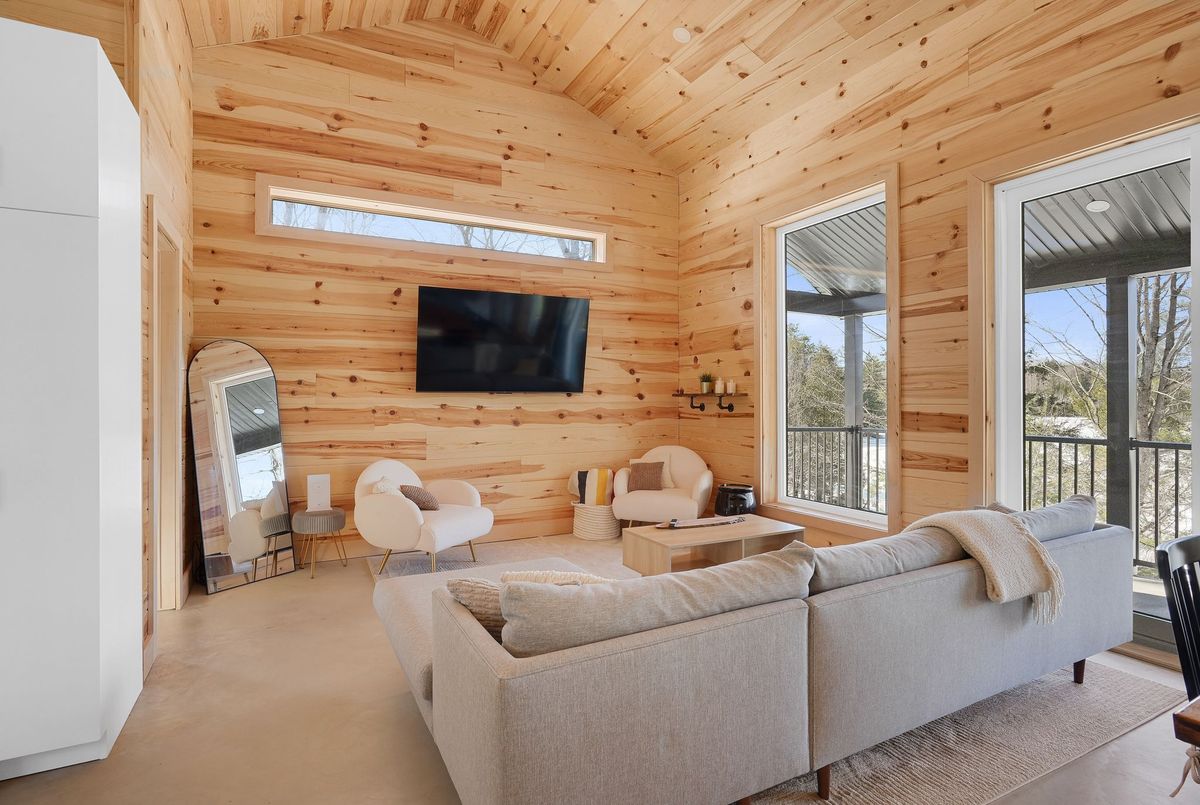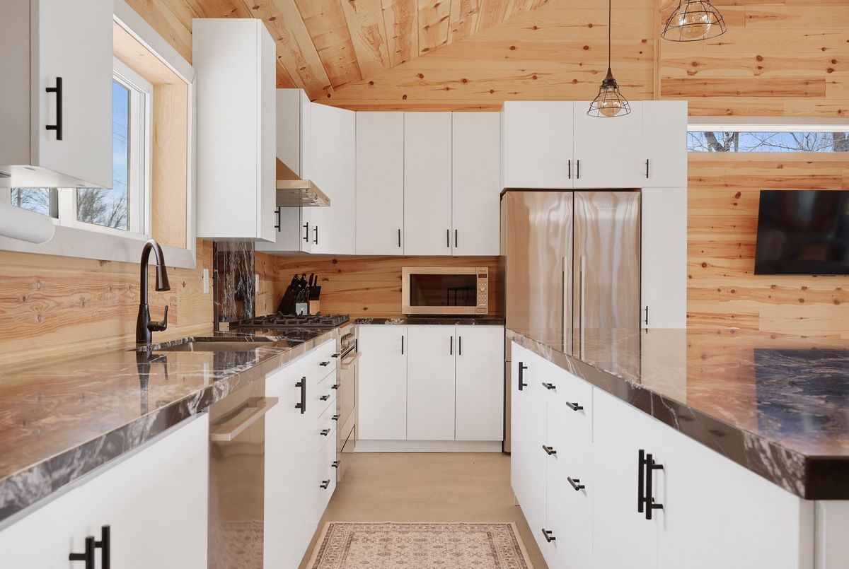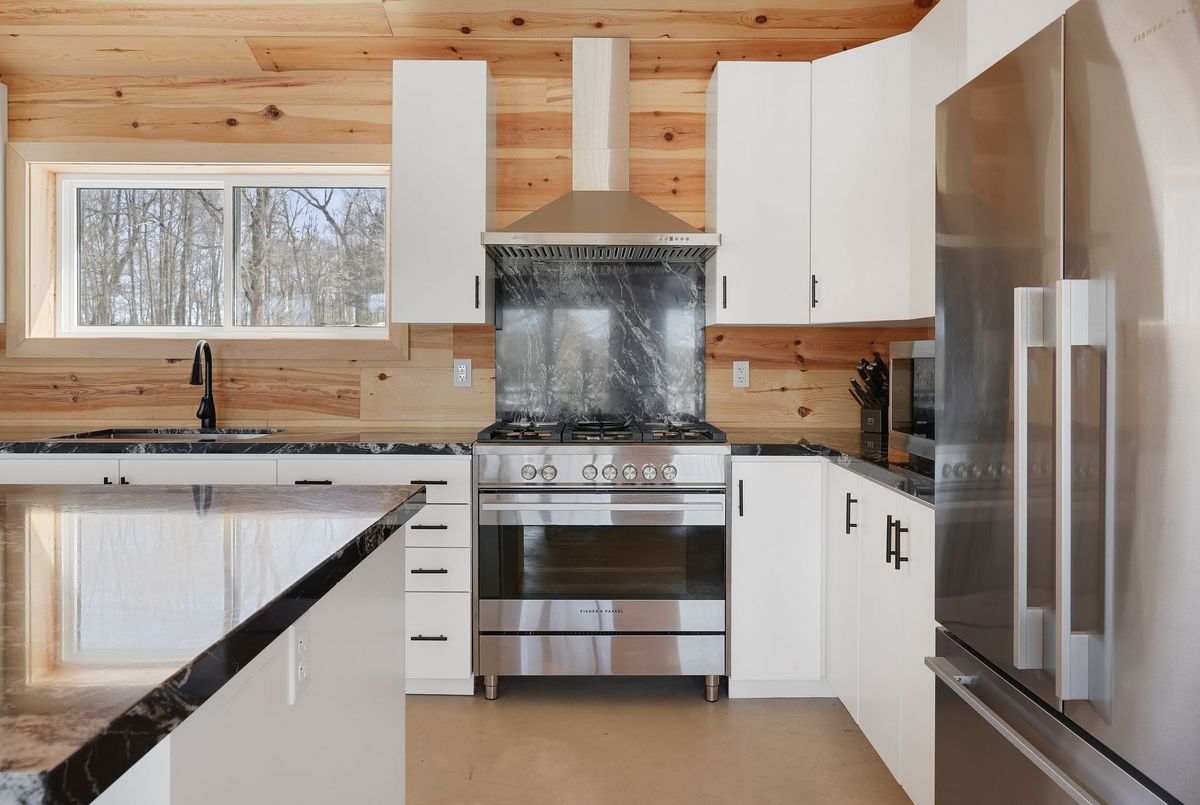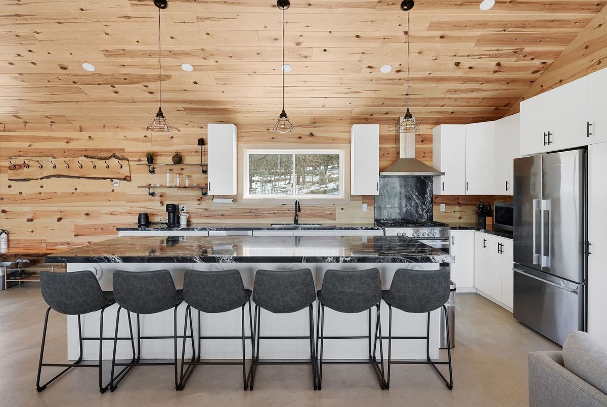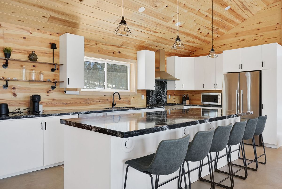 Tucked into a gentle lakeside lot where calm waters sparkle under golden sunset skies, this freshly built year-round cottage invites you to experience the best of northern life. Crafted with upgraded construction materials and quality finishes throughout, every detail of this property was designed for comfort, durability, and effortless style. Step inside and you are immediately greeted by soaring cathedral ceilings and pine-lined walls that radiate warmth and rustic charm. The open concept living area feels like a breath of fresh forest air. At the heart of the cottage, a gleaming granite-clad kitchen takes center stage. With a sprawling island that seats eight, it's made for everything from pancake breakfasts to evening cocktails with friends. Whether you are settling in for a movie night or curling up with an enjoyable book beside the glow of the electric fireplace, this cottage offers two separate lounge areas to suit your mood. Natural light floods in through expansive glass across the entire front of the cottage, bringing the outdoors in and putting those west-facing views on full display. And when the weather's less than perfect - or the summer sun feels a little too warm - you can still enjoy the lakeside breezes under the comfort of a covered porch just steps from the water. Downstairs, the full walkout basement extends your living space with a second luxurious bathroom and a flexible layout. With three+ bedrooms, plus a dedicated bunkroom waiting to be filled with the laugher of kids or visiting guests, there's room for everyone to make memories here. Heated concrete floors keep things cozy no matter the season, while smart, energy-efficient choices throughout reflect the thoughtful craftmanship of this cottage. From toddlers to grandparents, everyone will appreciate the incredibly gentle lot. And with reliable year-round road access, getting here is easy. This is more than a cottage. It's your lakeside retreat, and your front-row seat to nature's show.