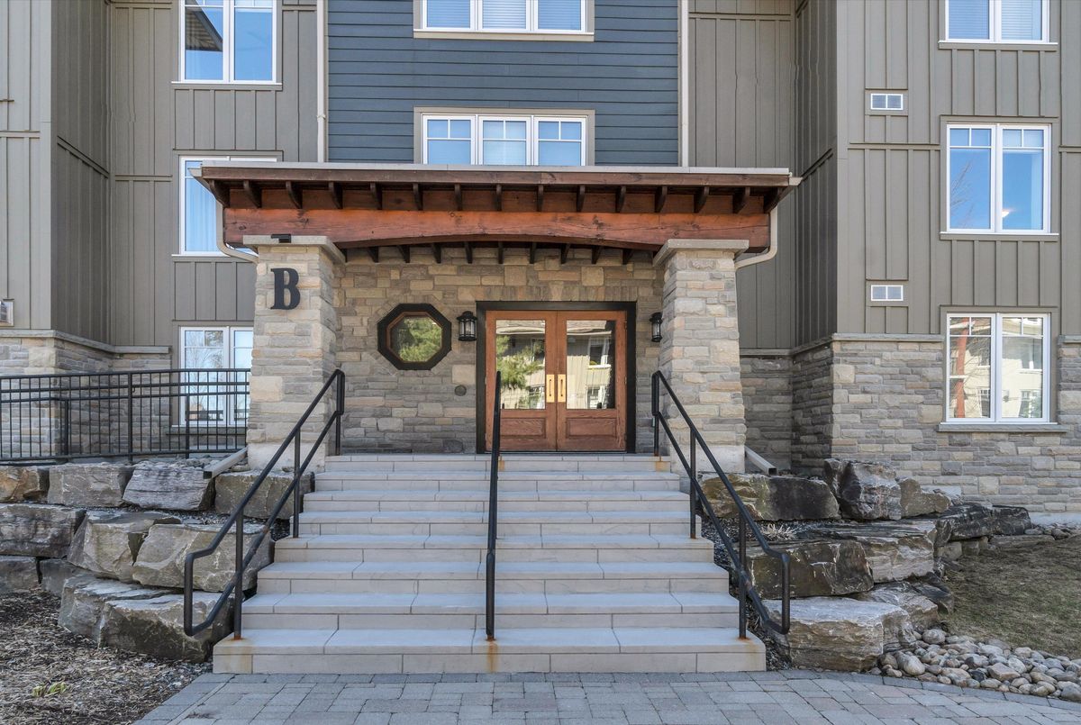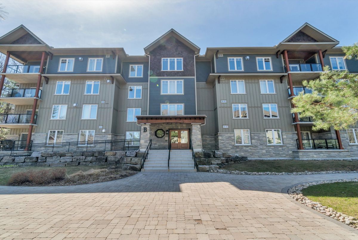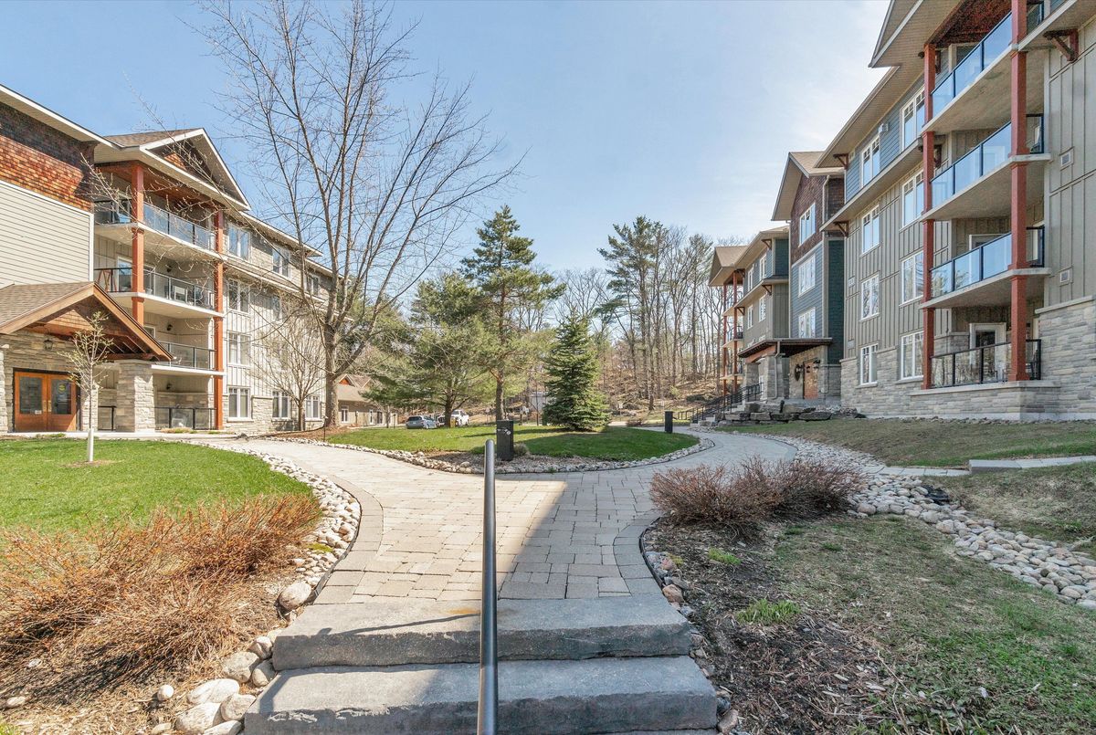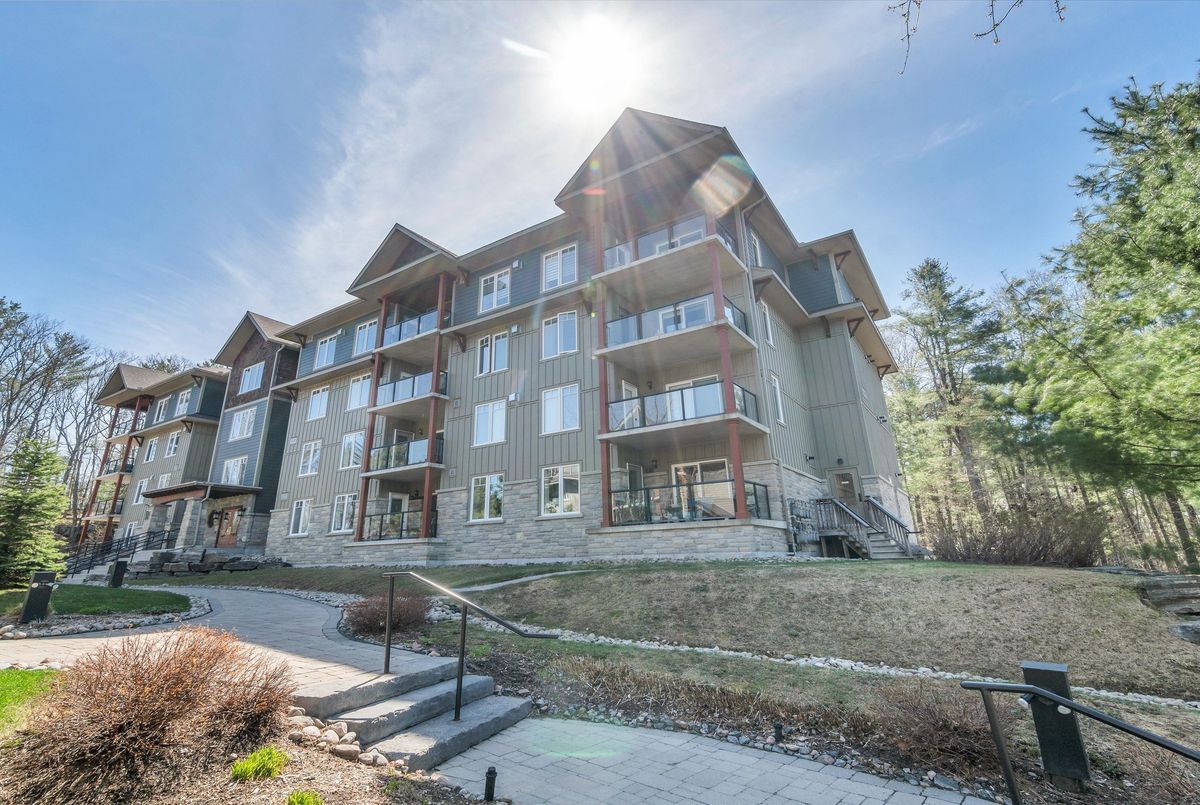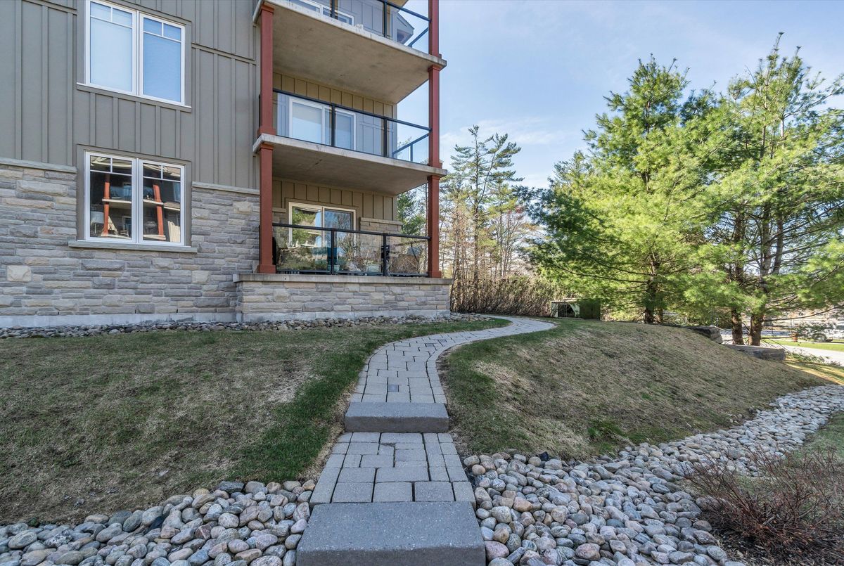 Discover the allure of garden-level living at Granite Springs Luxury Condos. This rare opportunity to own an exceptional corner unit with spectacular sunset views, presents a unique opportunity to embrace country tranquility with modern sophistication. Step inside and be greeted by a grand entrance that flows effortlessly into a spacious, open concept living, dining, and kitchen area. Gleaming hardwood floors radiate warmth, inviting you to unwind in your new sanctuary. The thoughtfully designed kitchen, complete with stainless steel appliances including a built-in dishwasher, microwave gives you an incredible space to create your next mouthwatering delicacies. If entertaining is important to you; you will enjoy the convenience of your new kitchen buffet top. The expansive open concept living and dining space, bathed in natural light from an oversized bay window, provides the perfect backdrop for creating cherished memories. Extend your living outdoors onto your private covered balcony. Just step outside and enjoy tranquil garden views where a friendly community atmosphere awaits. Retreat to the spacious master bedroom, featuring a private 3-piece ensuite and direct access to your garden balcony. A versatile second bedroom offers flexibility as a home office or welcoming guest suite. Need a little pampering? Make sure to indulge a little relaxation in your jacuzzi tub located in your second bathroom conveniently located just outside the second bedroom. This exceptional 2-bedroom, 2-bathroom residence boasts access to impressive amenities, including a grand clubhouse (fitness room, library, party room and kitchen). Convenience is further enhanced by your designated underground heated parking space and storage locker. Located just steps from downtown Bracebridge, enjoy the ease of strolling to charming boutiques, diverse restaurants, grocery stores, and a wealth of other social amenities.