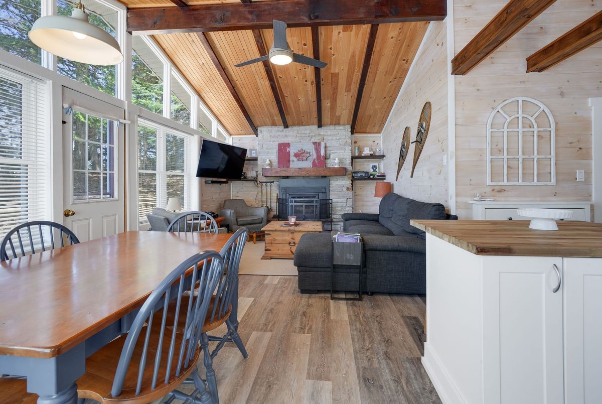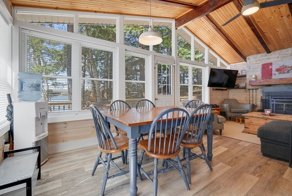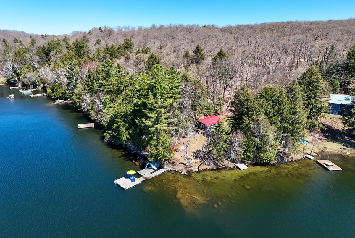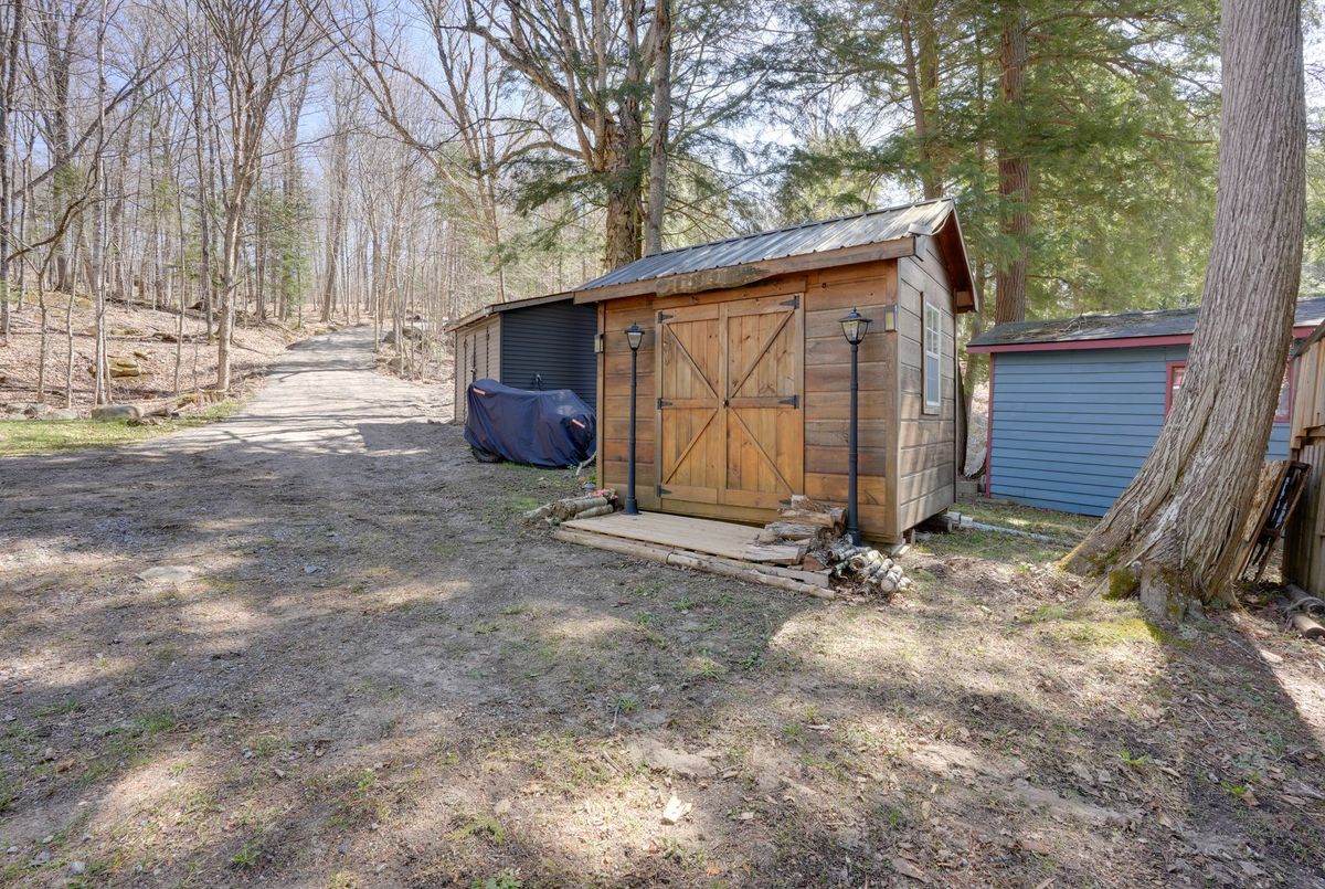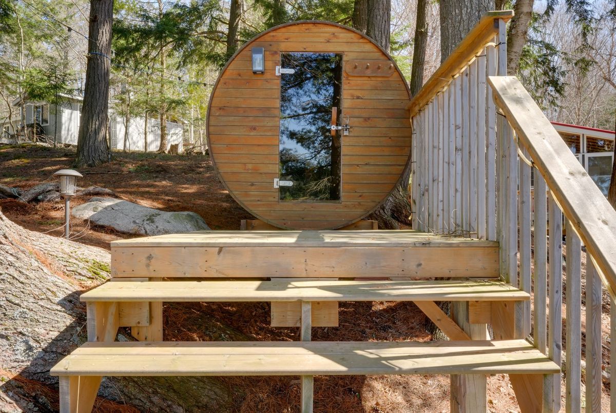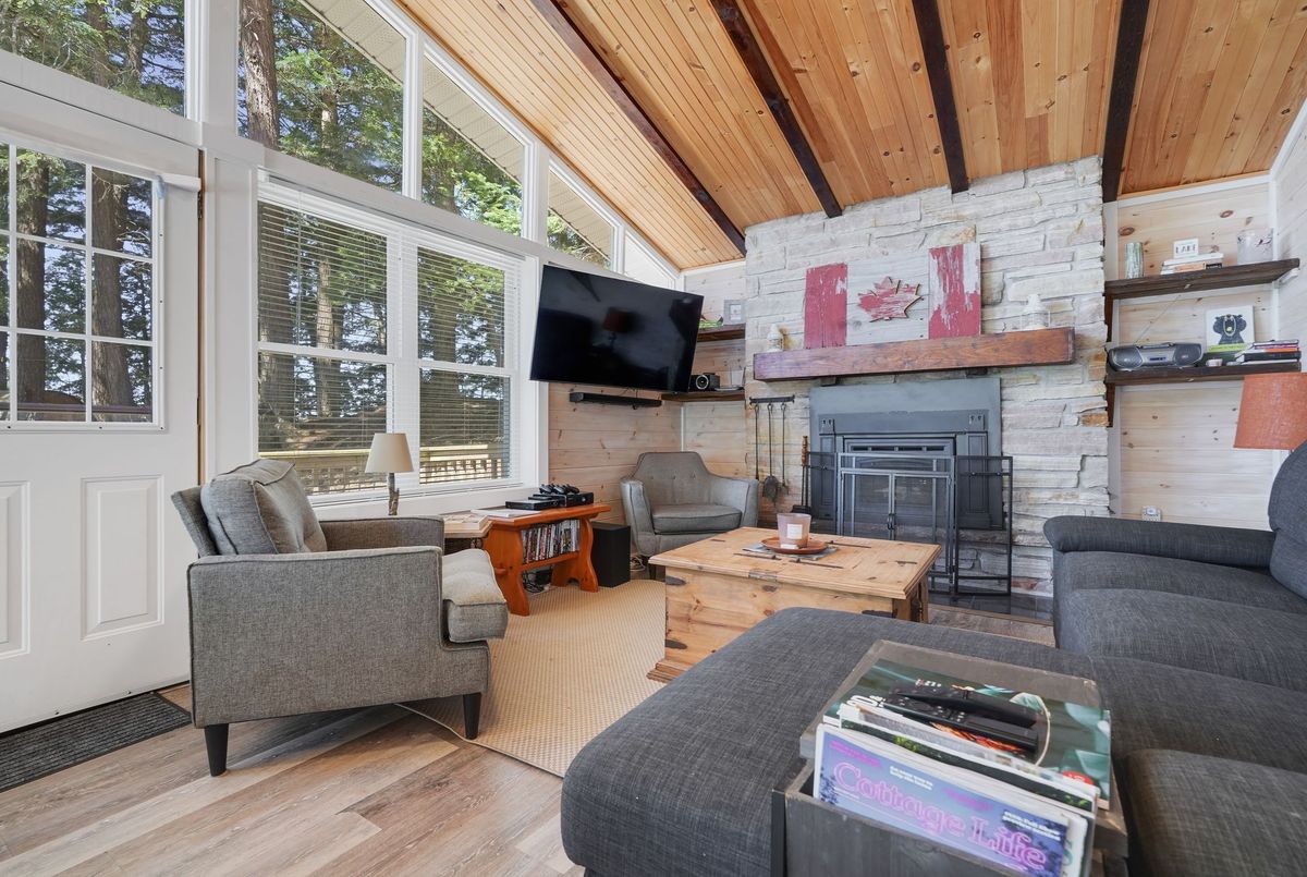 Step into the kind of cottage that feels like a warm hug cute as a button and brimming with charm. This delightful 3-bedroom retreat, complete with a cozy bunk room for the for the kids, is a picture-perfect escape for all seasons. Inside, the trendy bleached wood interior captures the essence of effortless lakeside style, while the central wood-burning fireplace with an insert adds a crackling glow to those crisp evenings. The open-concept design ensures everyone stays connected, whether gathered around the stylish dining area facing the lake or spilling out onto the deck to soak in those mesmerizing panoramic views. With due west exposure, sunsets here are nothing short of magical - each evening feels like a private showing just for you. Out on the sprawling dock, the fun begins. From thrilling plunges off the deep end to carefree afternoons on the waterslide, there's joy for every age. Prefer a slower pace? The shallow sandy shoreline invites wading, splashing, or simply soaking up the sun. And when it is time to truly unwind, the barrel sauna nestled among mature pines offers a serene retreat, its window framing the rippling waters. For extra guests - or teens seeking their own haven - the detached bunkie is the ultimate hangout, full of potential for sleepovers and laughter. The one-acre property provides space to roam, yet its thoughtful layout keeps the focus on lakeside living. Set on a mid-size lake perfect for boating, fishing and water-front sports, this cottage is as much about adventure as it is relaxation. With a year-round road access and a design that is winter-ready, this is a haven for all seasons. Whether you are snowshoeing on the frozen lake or enjoying summer mornings by the water, the possibilities are endless. Perfect for personal enjoyment or as an income-generating rental, this charming retreat lends whimsy and practicality in a way that is simply irresistible. Your lakeside story begins here.