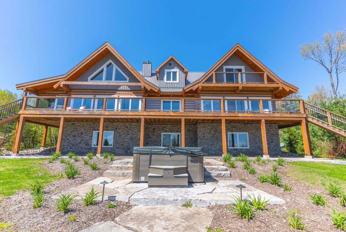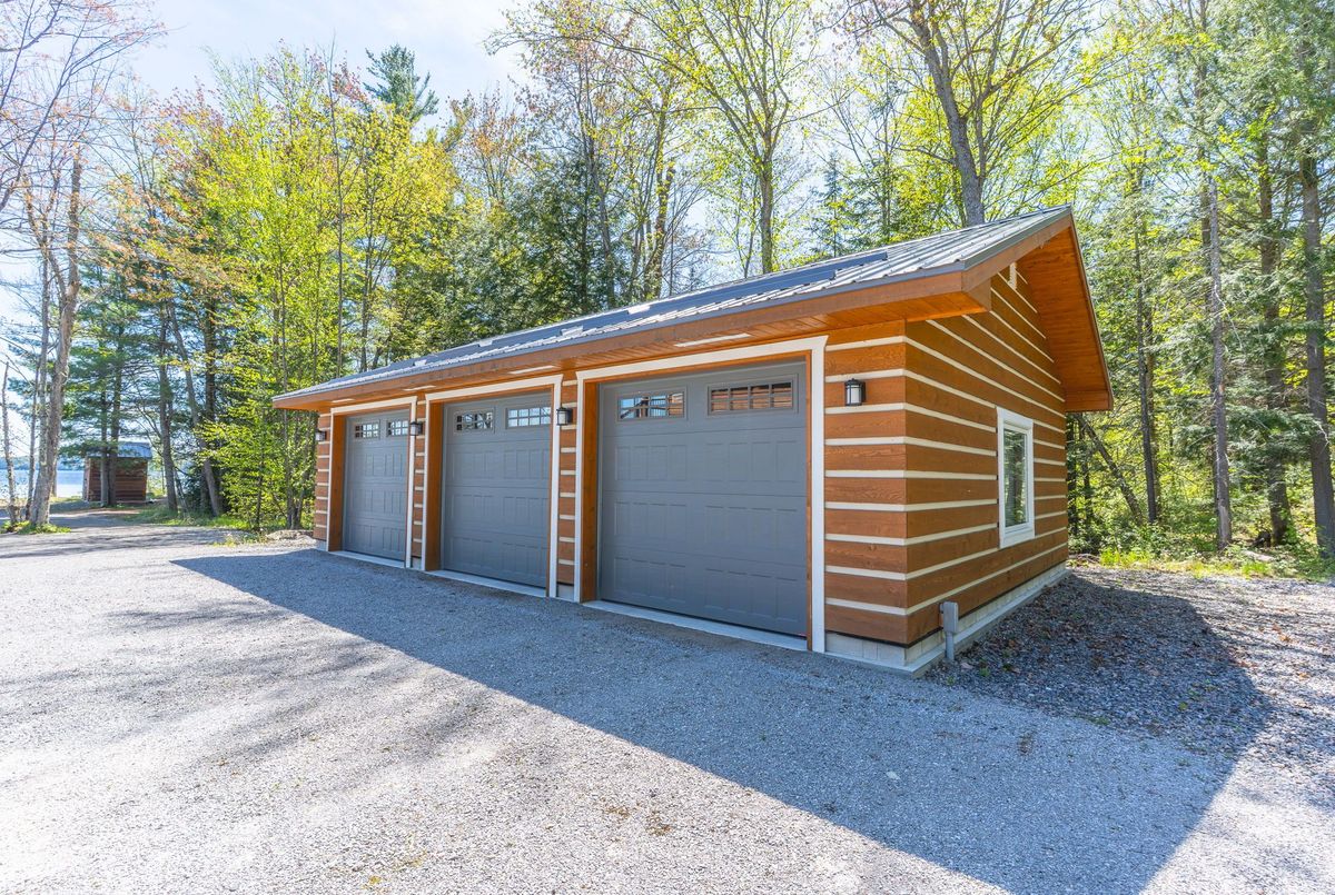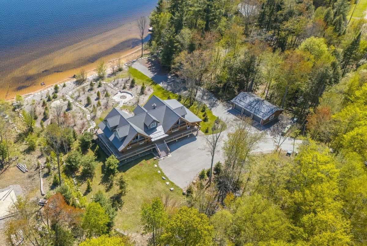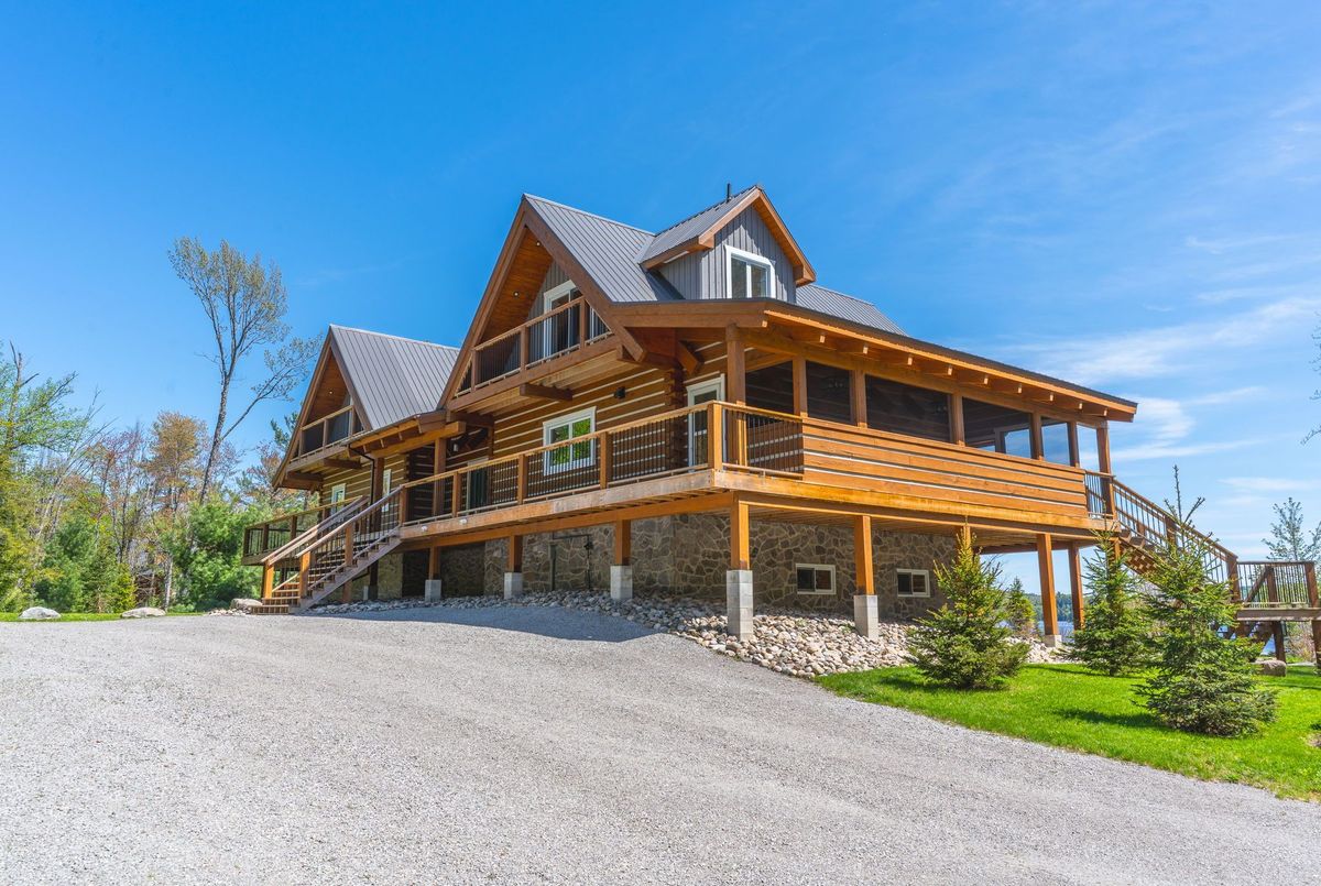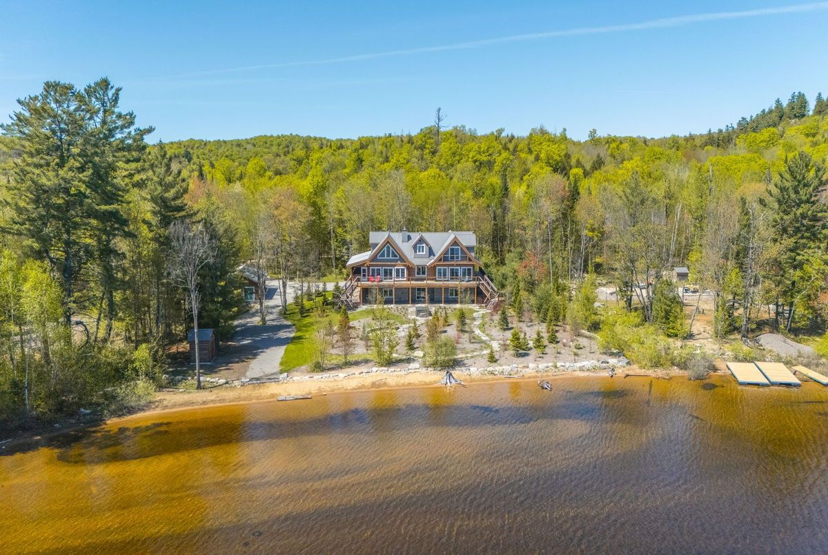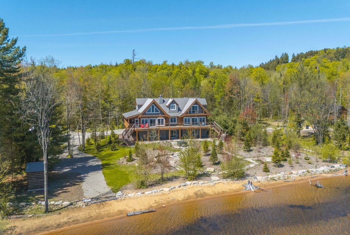Discover the epitome of lakefront luxury in this magnificent 3-bedroom, 5-bathroom log home situated on Redstone Lake's pristine shoreline. This exceptional 6-year-new gated property boasts spectacular panoramic lake views, 209 feet of gorgeous sand beach, and coveted southern exposure for all-day sunshine on a stunning professionally landscaped level lot. The extensively landscaped grounds showcase mature evergreen and deciduous trees, thoughtfully arranged shrubs and plantings, with elegant flagstone walkways and a beautifully lit path guiding you from cottage to lake. Additional features include a large sunken firepit with built-in lighting and a premium Beachcomber 730 Hybrid 4 Hot Tub. The bright interior showcases stunning lake vistas through oversized windows that flood each room with natural light, while a unique guillotine wood-burning fireplace serves as the centerpiece of the open-concept main floor. Enjoy spa-like bathrooms including heated floors after a full day enjoying the outdoors. A spacious wraparound deck with glass panel railings extends your living space outdoors, perfect for entertaining while overlooking the tranquil waters. Upstairs, generously sized bedrooms and a beautiful loft each feature private walk-out decks with serene lake views. The fully finished basement provides additional versatile living space, while an impressive detached 3-bay garage offers exceptional storage for multiple vehicles, watercraft, and all your recreational equipment. Unlike many lakefront properties, this meticulously maintained home offers easy year-round accessibility, allowing you to enjoy both summer water activities and winter adventures. Whether as a permanent residence or luxurious vacation retreat, this premier Redstone Lake property delivers the ultimate lakefront lifestyle where rustic charm meets modern luxury in perfect harmony.