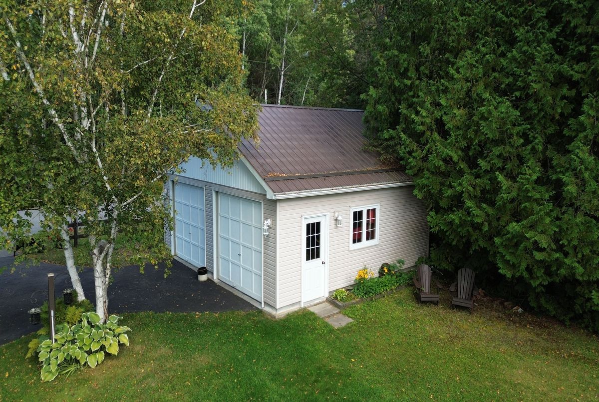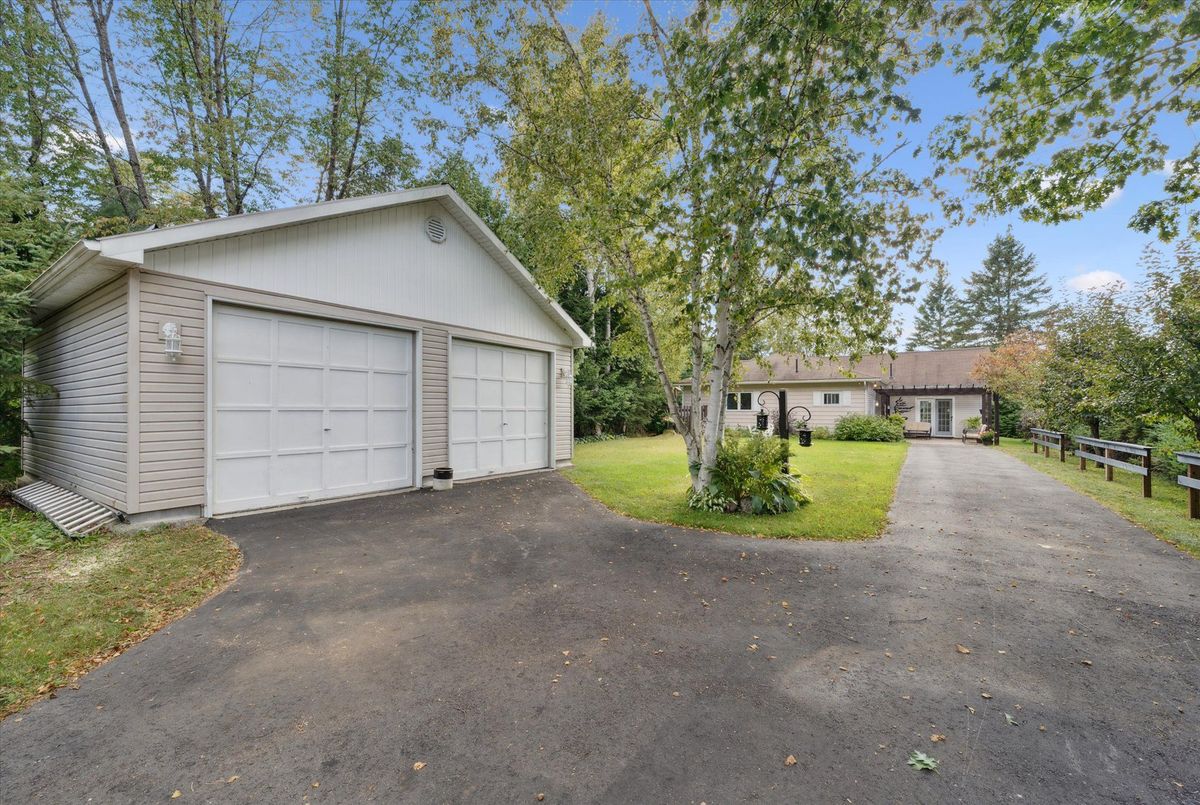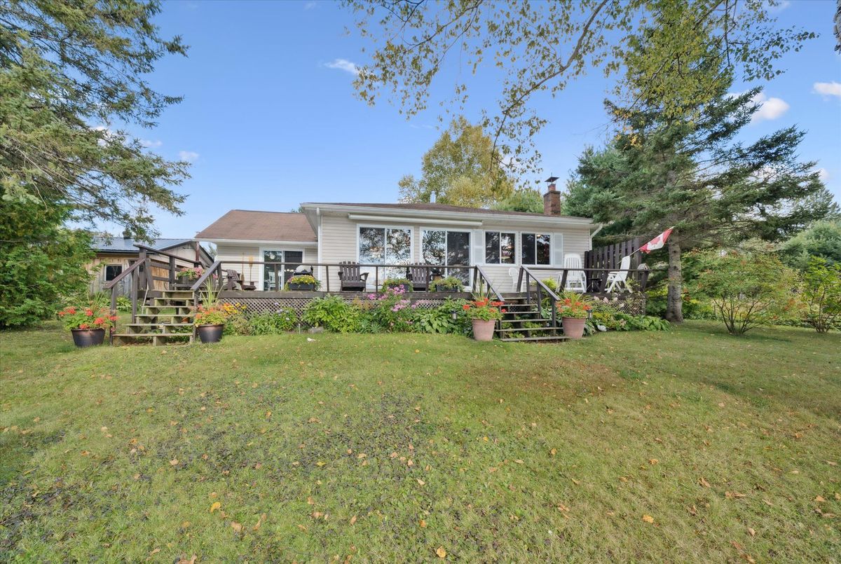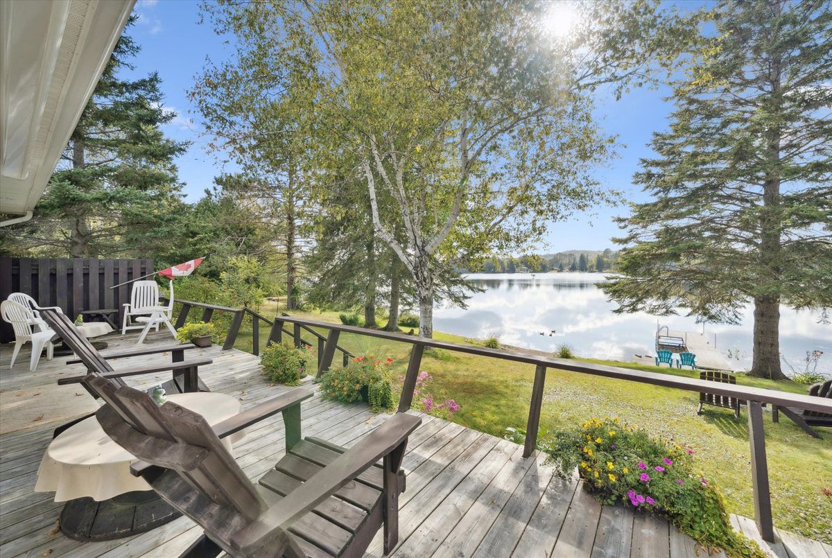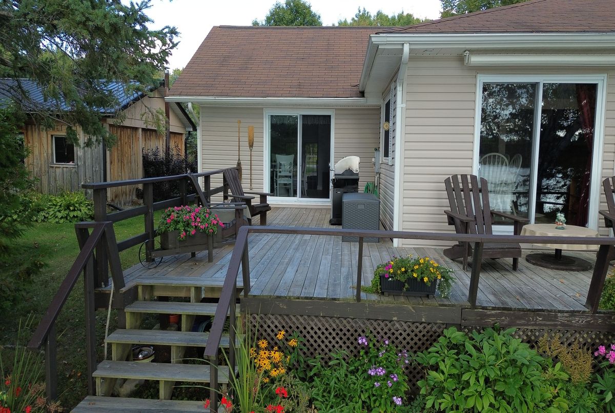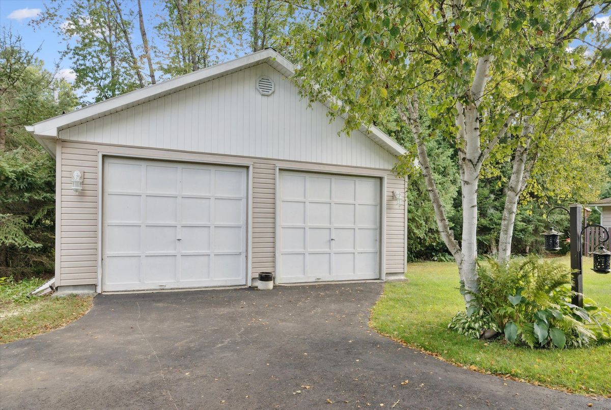 Enjoy waterfront living in this large bungalow on Hassard Lake in Kearney on a paved, year round road very close to the town of Kearney. There are 4 comfortable bedrooms. The Primary is over-sized with a sitting area and ensuite bathroom. The living, dining and kitchen areas are comfortable for family and friends to gather and in the winter, warm up at the wood burning fireplace. This area opens up to a large deck and views to the spectacular waterfront. Off of the kitchen is a fun games-room or second dining room for the big crowds. The lot is level so no concerns about walking steps tow the waterfront. The lot is large and has a paved driveway and a large 2-car garage which is detached from the house has a metal roof. (The garage has been pre-wired for electricity.) The well is a sand-point with sediment filter. You will find the laundry and large workshop are in the unfinished basement. This property is turn-key and includes all furniture and appliances as well as the items in the garage. The sump pump has a battery back-up. There is a 200 amp electrical service and heat is by the propane gas stove in the kitchen with electric baseboard heaters as secondary heat. The waterfront features hard-packed sand and shallow water which progressively gets deeper so that you can dock your boat easily. Updates: electrical and plumbing 2003, heating 2018, shingle roof 2014.