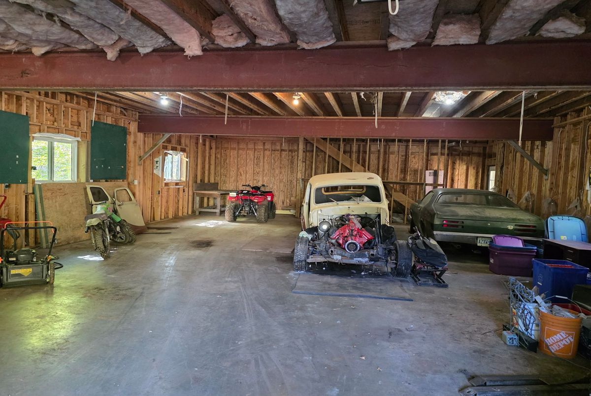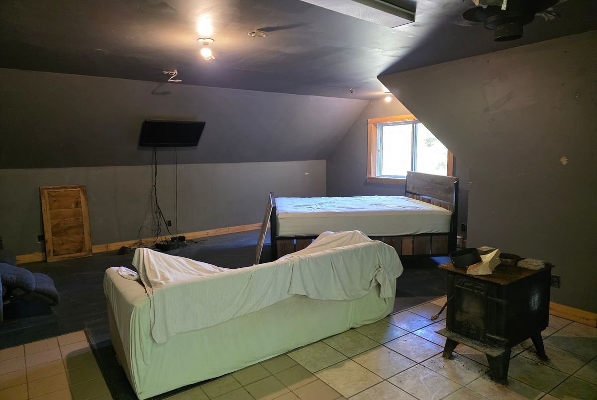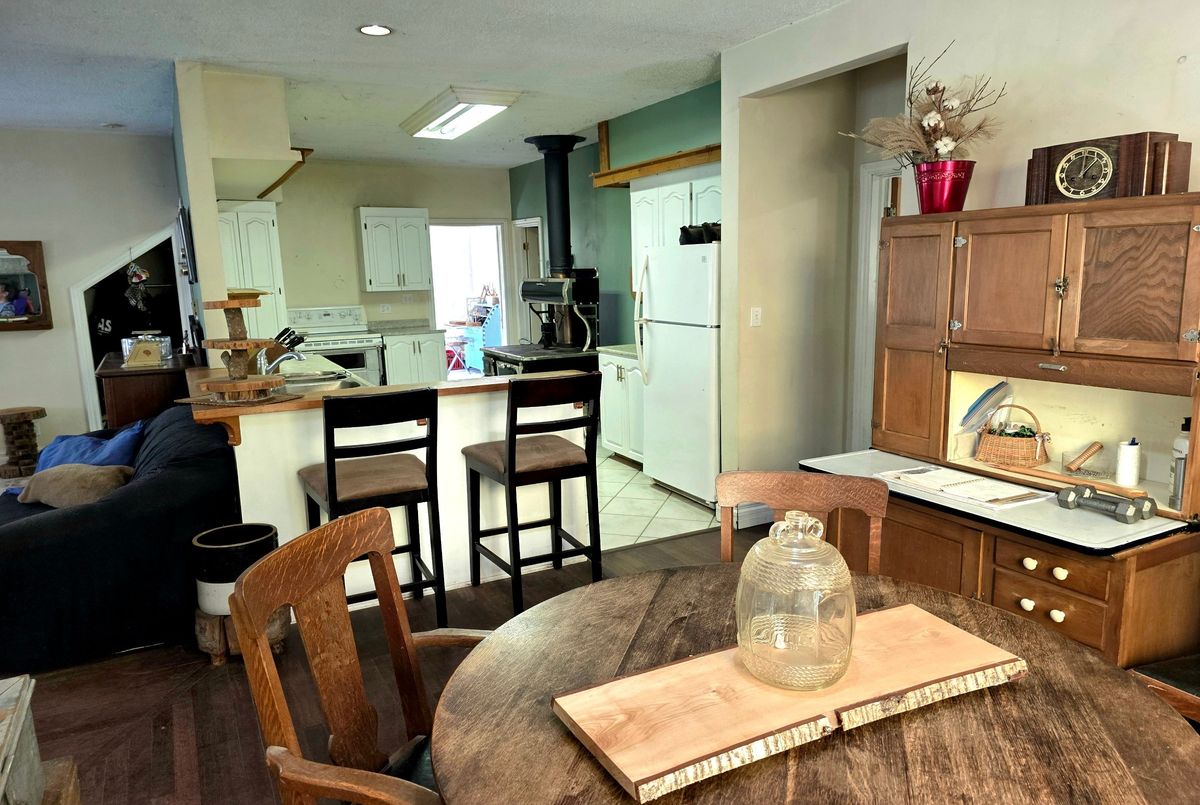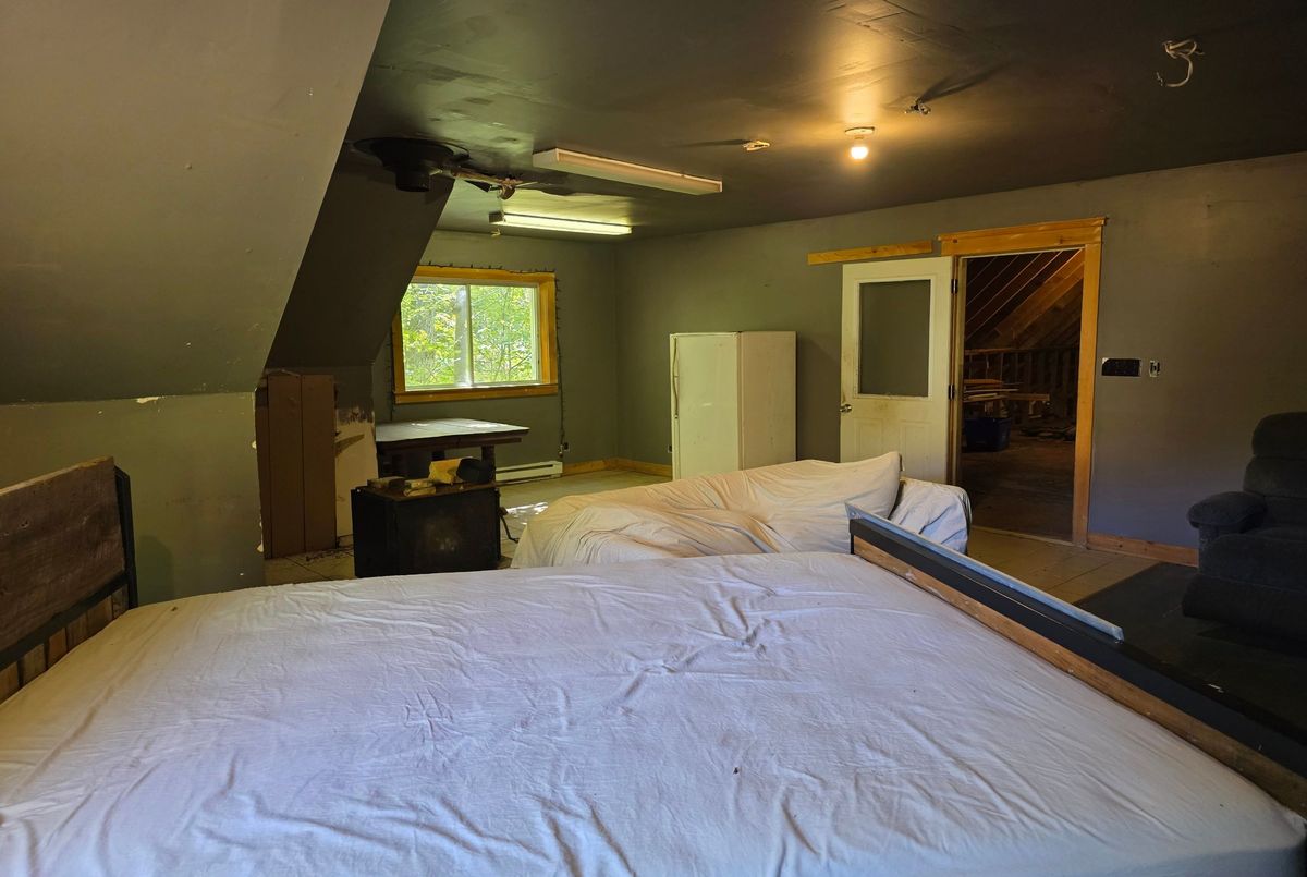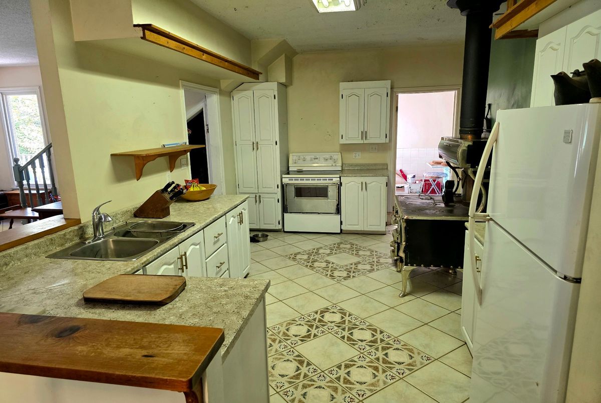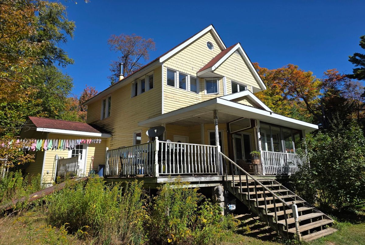 Welcome to this spectacular opportunity to own an open concept two-storey picturesque home perched on a granite outcropping with sunlight streaming in. The home has 9 foot ceilings and a wrap-around porch on a private, 5 acre lot. Three large bedrooms and two full bathrooms plus a 2 pc bathroom roughed in on the main floor. The Living Room features a wood-burning fireplace. Enjoy the convenience of having the Primary Bedroom complete with ensuite and walk-in closet on the main floor. Off of the kitchen is a mud room / laundry. The house has 200 amp electrical panel and the garage has a seperate 200 amp electrical panel. The house is in need of updating / repair. The vehicles, batteries, paints, etc. are in the process of being removed. This is a diamond in the rough - ready to be shined up to it's glory. In addition, there is a huge 49 ft x 29 ft garage with a 21 ft x 49 ft loft above is every man's dream of a, spacious garage / workshop!