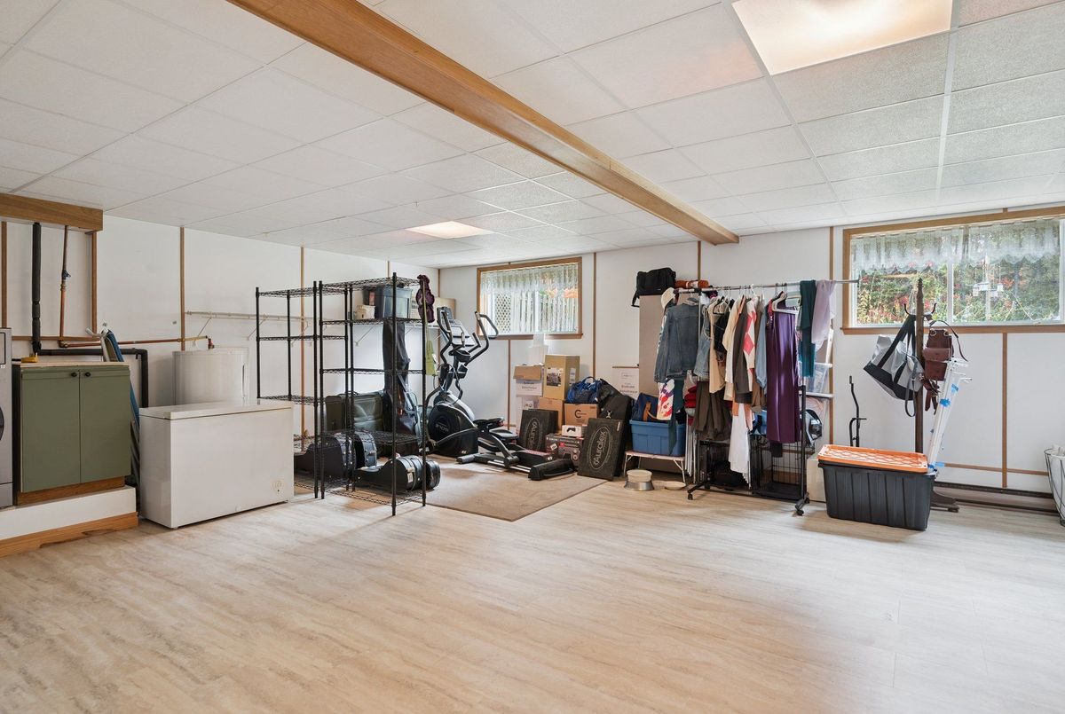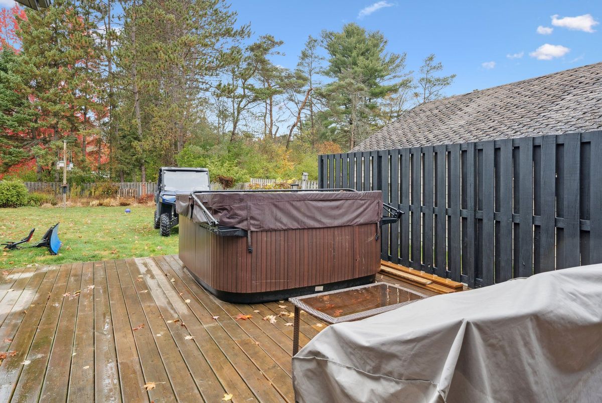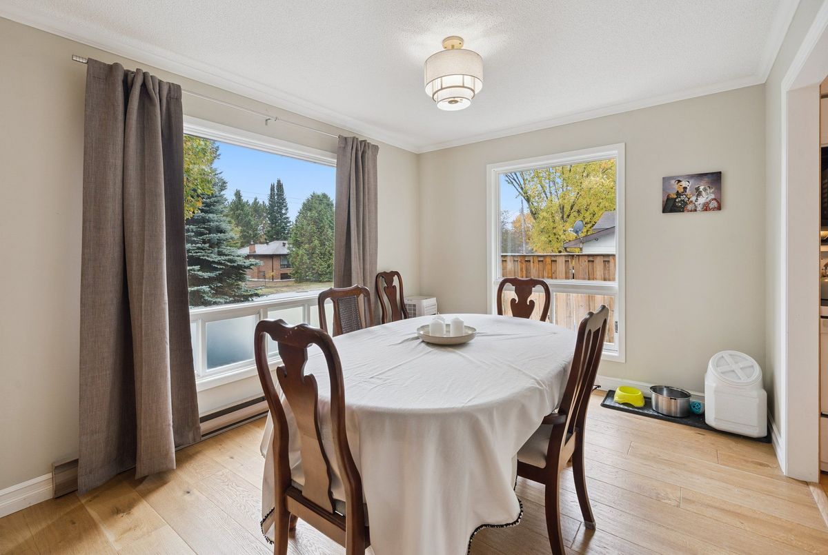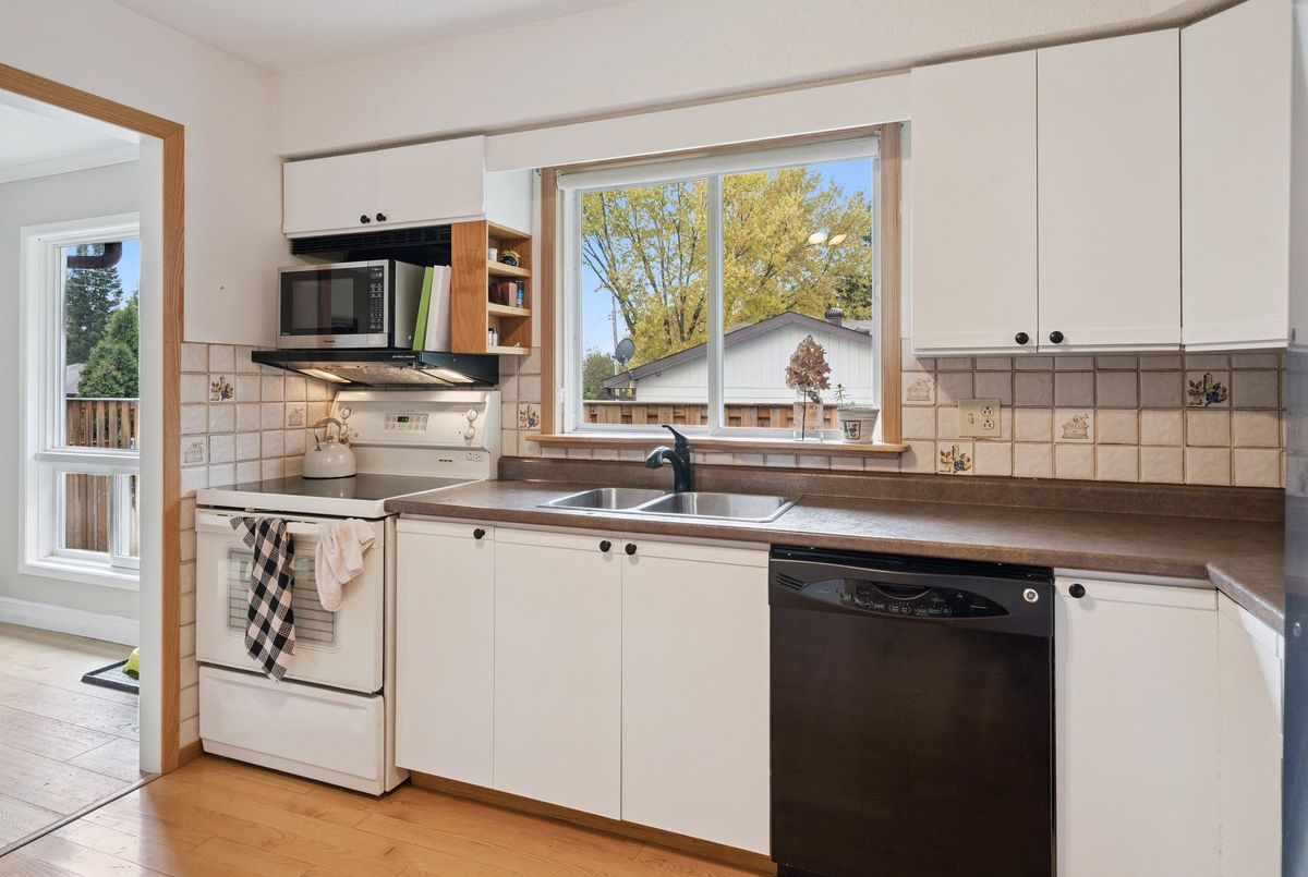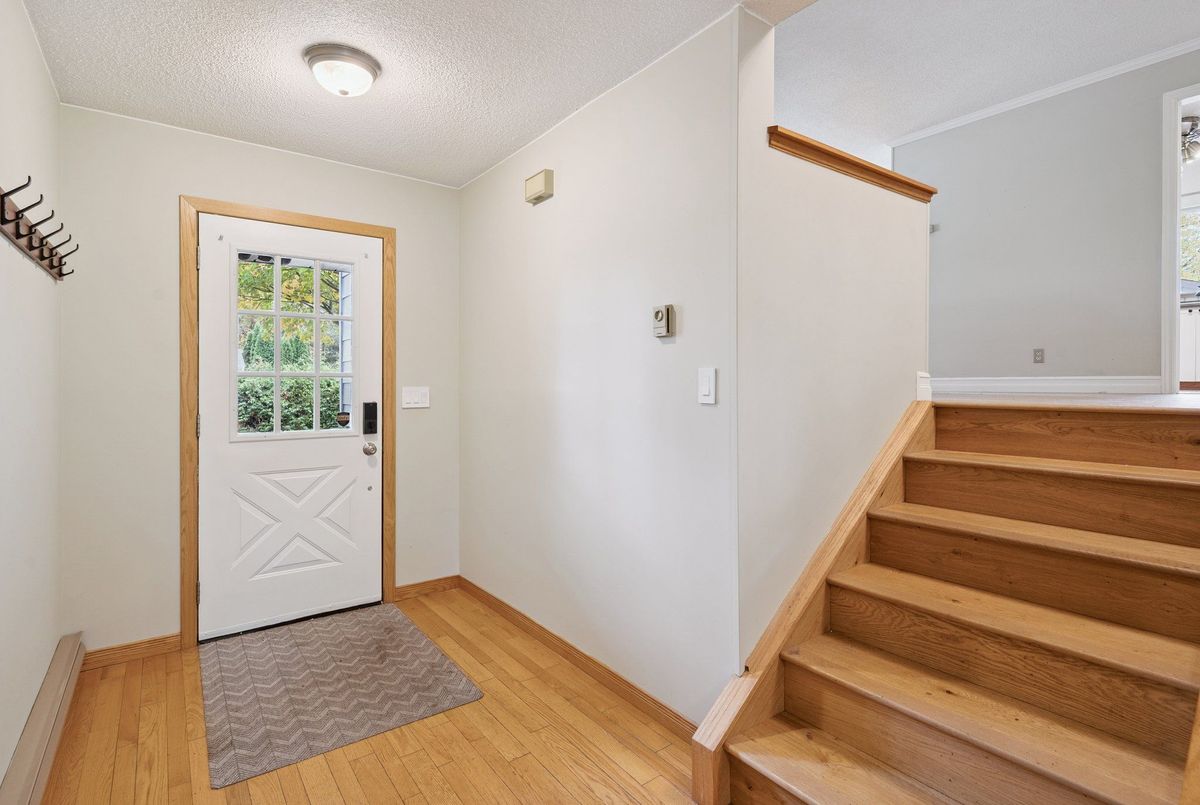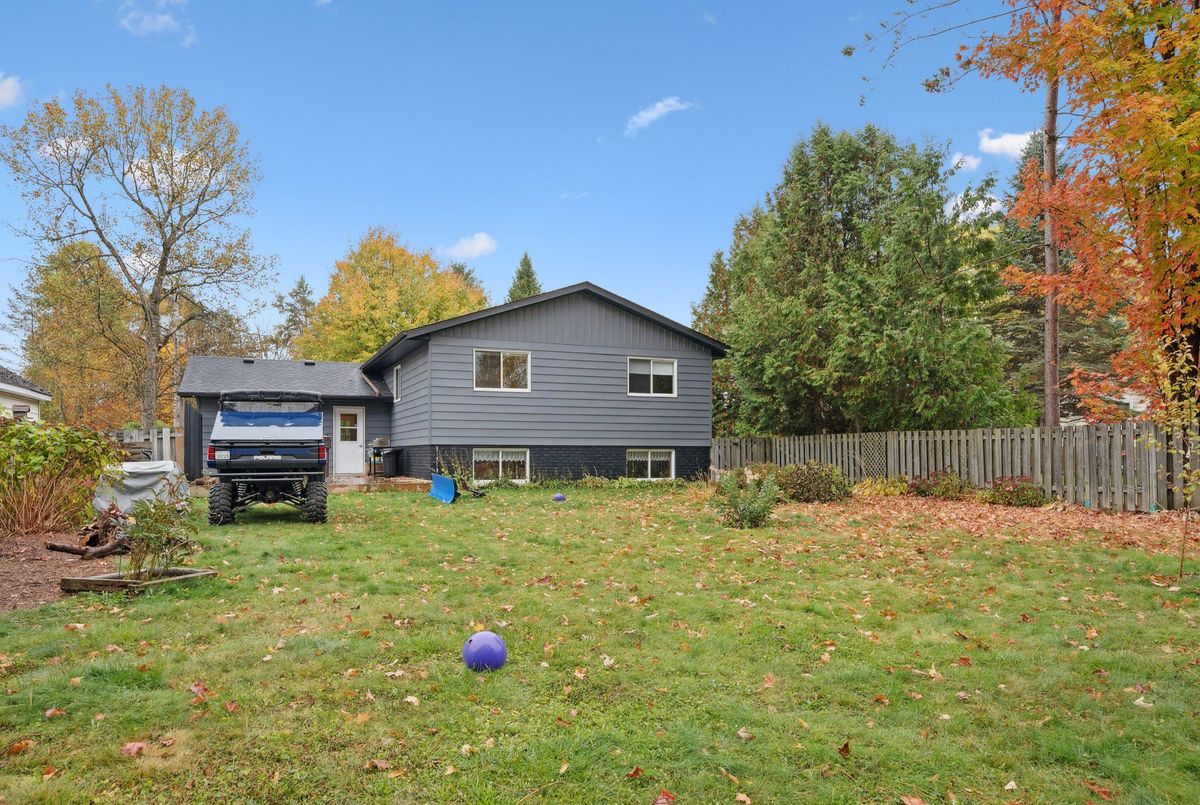 A Welcoming Bungalow Surrounded by Nature and Comfort: welcome to this charming 3 bedroom, 3 bathroom bungalow which blends warmth, practicality, and timeless appeal. From the moment you step into the spacious front entry, you'll feel at home. This inviting space offers direct access to the garage, plenty of room for coats and seasonal gear, and a convenient walkout to the rear deck - the perfect spot to relax and take in views of the lush, private backyard. The main floor was designed for easy living and entertaining, featuring wide plank light wood flooring and large windows that fill the home with natural light. The bright eat-in kitchen is the heart of the home, ideal for casual meals and everyday connection, while a formal dining area stands ready for special gatherings with family and friends. The kitchen cabinets have been painted, as has the whole main floor. Also new Decora switches, new carpets with upgraded underpad in the two bedrooms, new light fixtures, electronic door lock and integrated exterior lanterns with cameras. Down the hall, you'll find three generous bedrooms, including a peaceful primary suite with its own ensuite bath and AC / heat pump - your personal haven for rest and relaxation. The finished lower level offers even more space to unwind, complete with a comfortable rec room anchored by a natural gas fireplace - perfect for movie nights or game days. There's also a versatile flex area that includes laundry, utilities, and a handy dog wash station for your four-legged family member. Set on an extra-deep, beautifully landscaped in-town lot, this home is surrounded by mature trees and perennial gardens that create a serene, park-like atmosphere. And with a back-up Generac on standby, you can enjoy peace of mind year-round. The exterior has been painted and roof shingles / roof vents have been replaced. Lovingly maintained and full of charm, this bungalow offers the perfect blend of comfort, convenience, and natural beauty.
